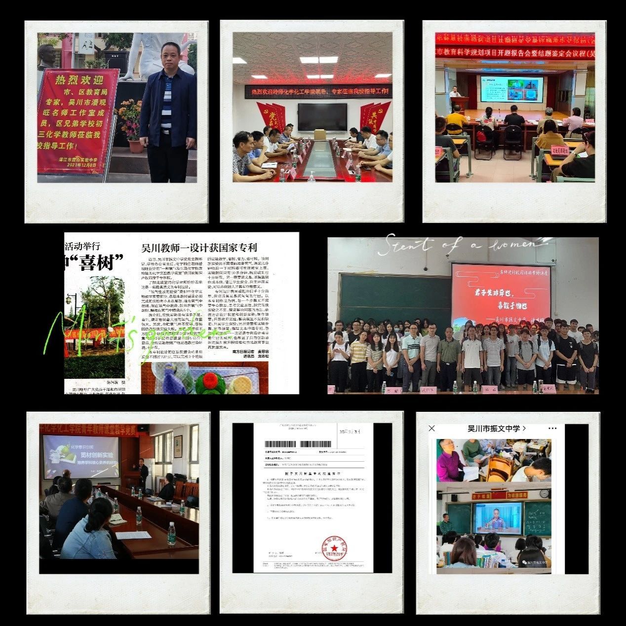 2021年,该校潘观旺老师获批成立“吴川市潘观旺名教师工作室”,在化学化工学院的帮扶下,两年多来取得不错的成绩。其中获国家级专利1项,省级课题立项并结题1项,发表论文3篇,参加精品课例、教学设计、实验技能创新等竞赛获省、市级奖8项,指导学生参加竞赛获市级奖2项,另有专著一本成书待出版。潘老师是我校校友,也是化学化工学院名师进校园的专家,同时被聘为华南师范大学教师教育学部、省级教师发展中心兼职研究员,其“成名家”的事迹被“南方+”、《南方日报》、《广州日报》、《湛江日报》等媒体有所报道。在潘老师的带动下,该校教师更专心教学,致力发展,如罗世富老师积极参与各项技能培训,开展教研和精品课例设计,2021年获省级教学设计二等奖1项,2022年晋升一级教师资格。