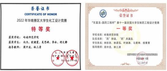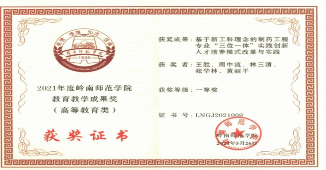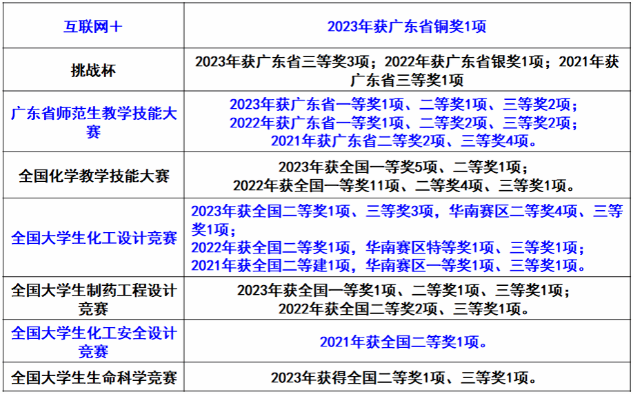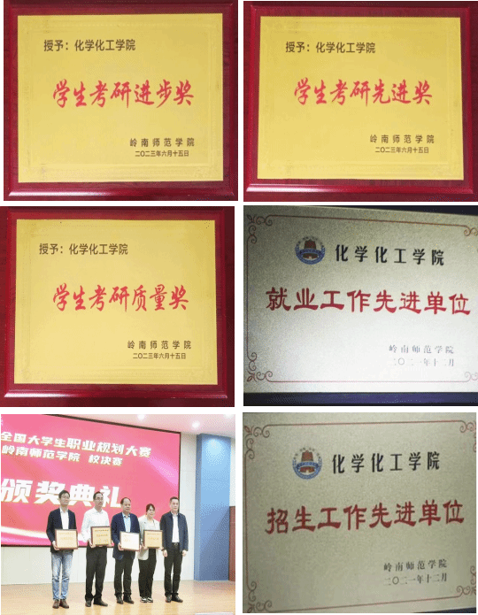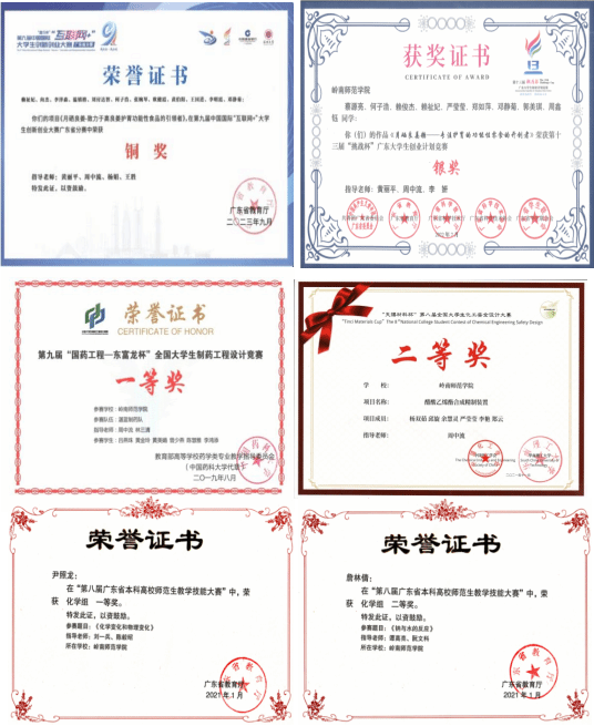 以学科竞赛为驱动,项目承载,校企协同,依据“学中做、做中学、研中学”的教学理念,构建了“教、赛、研”三位一体的实践创新人才培养模式,获岭南师范学院教育教学成果一等奖。近三年来,学院学生在各级赛事中获奖70余项。其中包含互联网+广东省铜奖1项;挑战杯广东省银奖1项、三等奖4项;广东省师范生教学技能大赛一等奖2项、二等奖3项、三等奖8项;全国化学教学技能大赛一等奖16项、二等奖5项、三等奖1项;全国大学生化工设计竞赛二等奖3项、三等奖3项;华南赛区特等奖1项、一等奖1项、二等奖4项、三等奖3项;全国大学生制药工程设计竞赛一等奖1项、二等奖3项、三等奖2项;全国大学生化工安全设计竞赛二等奖1项;全国大学生生命科学竞赛二等奖1项、三等1项。