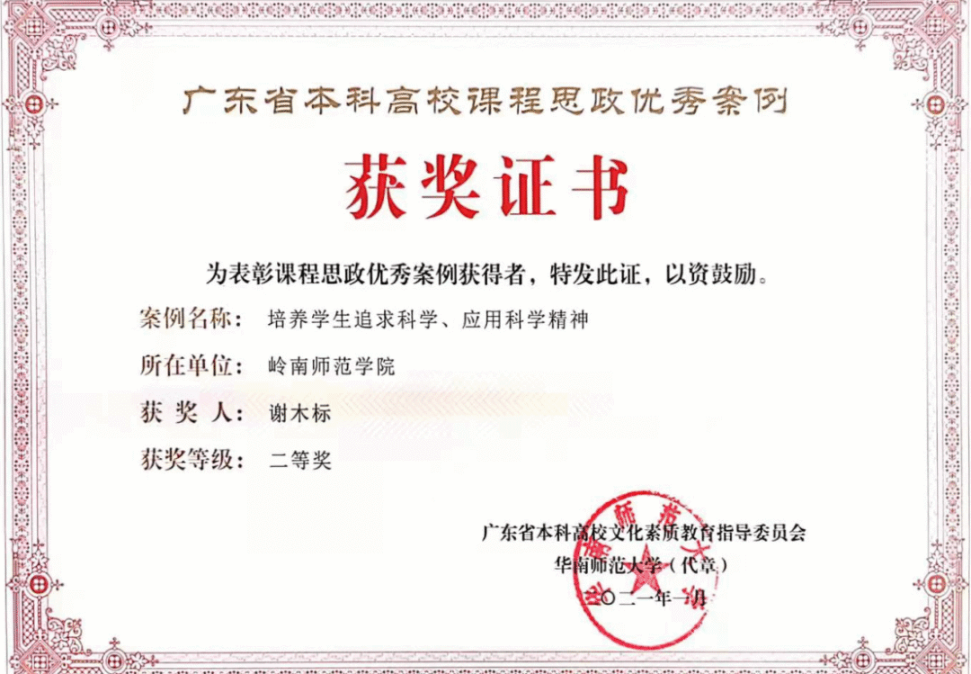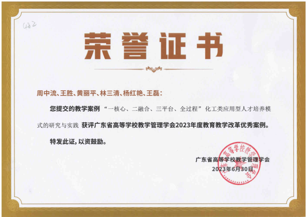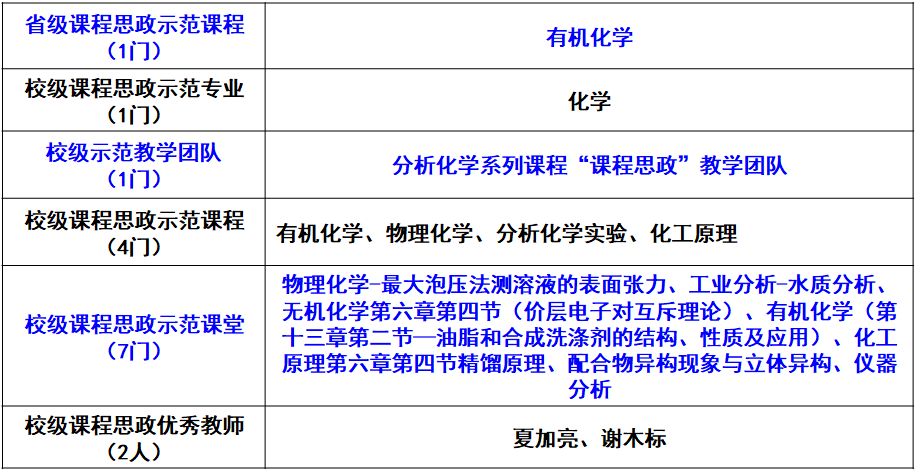 根据中共中央、国务院《关于加强和改进新形势下高校思想政治工作的意见》提出的“三全”育人要求,化学化工学院竭力强化教师立德树人意识,在课程中有机融入思政教育元素,推出了一批育人效果显著的精品专业课程,打造了一批课程思政示范课堂,选树了一批课程思政优秀教师,形成专业课教学与思想政治理论课教学紧密结合、同向同行的育人格局。学院获得省级课程思政示范课程1门,校级课程思政示范课程4门,校级课程思政示范课堂7门,校级课程思政示范专业1个,校级课程思政示范团队1个,校级课程思政优秀教师2人,获广东省本科高校课程思政优秀案例二等奖1项。