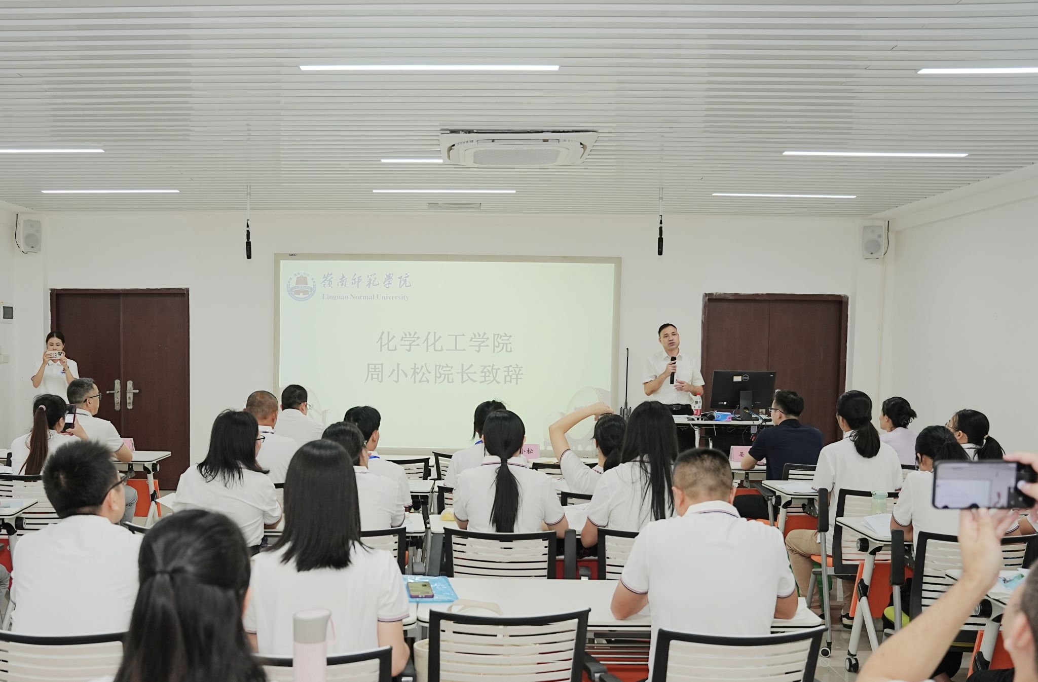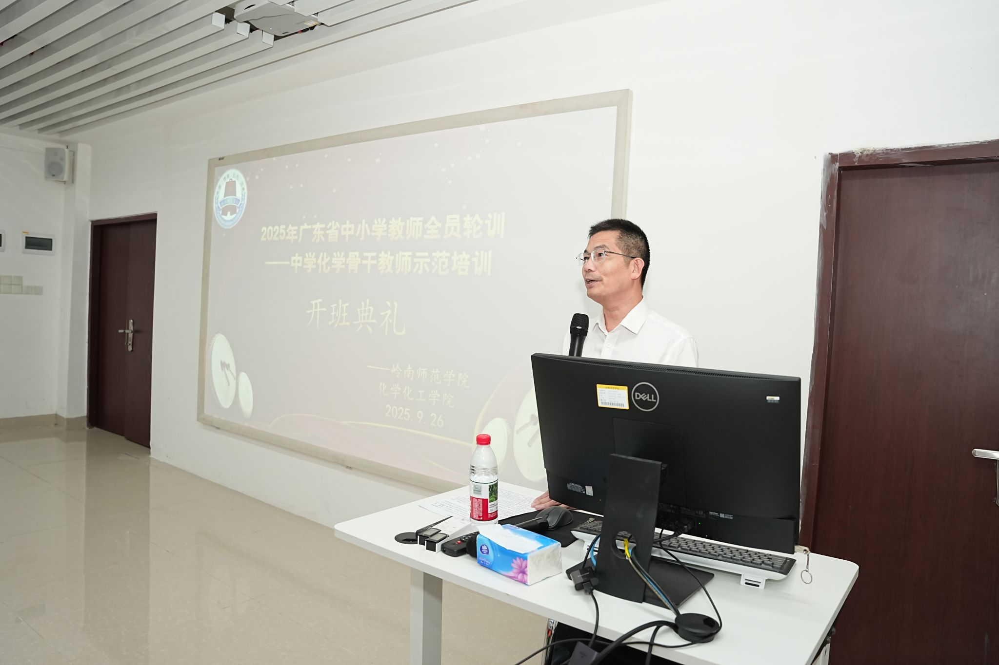 为深入贯彻落实广东省关于加强粤东西北地区教师队伍建设的决策部署,着力提升中学化学学科的教学质量,2025年9月26日,由岭南师范学院化学化工学院承办的“2025年度粤东西北地区中小学教师全员轮训——中学化学骨干教师示范培训”开班典礼在教五教学楼A-611教室隆重举行。本次培训精准对接湛江、茂名两地教师的实际教学需求,吸引了来自两市共51名中学化学骨干教师参加。化学化工学院院长周小松、培训项目负责人彭兰贞与班主任谭高亮老师共同出席典礼。典礼由学院党委书记赵海波主持。