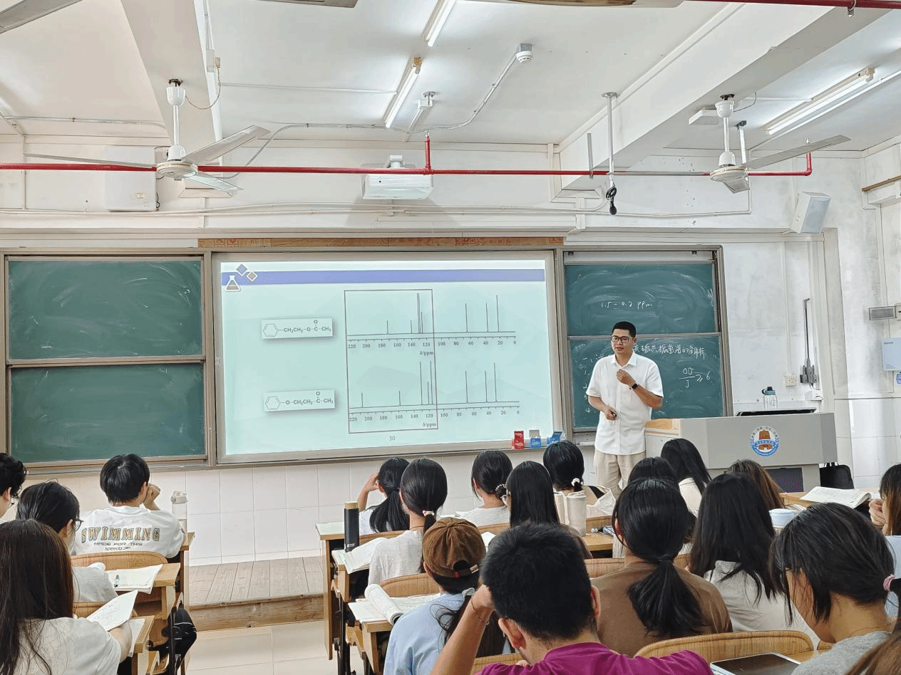 课上,吴老师从展示植物黄花蒿,观看[创新中国] 屠呦呦院士视频引入,讲述屠呦呦团队在艰苦条件下,经历无数次试验失败后,终于从黄花蒿中分离出抗疟新药青蒿素,并获得诺贝尔奖故事。通过这故事进行课程思政教育,同时通过利用核磁共振等技术确定青蒿素的结构引入核磁共振波谱暨引入教师课题组利用核磁共振波谱取得的一些科研成果。全课以“核磁共振氢谱图可以提供什么信息?”“这些信息与化合物结构有什么关系?”为主线,紧密联系学科发展前沿,根据科研工作中单凭一种光谱往往不能解决问题的实际情况,跳出教材,利用软件设置了两个能解不同结构的例题,让学生掌握核磁共振氢谱解析方法,并初步学会如何在研究中工作中应用这些方法来解决实际问题。课堂同设置学生上台展示结构、讲解谱图的解析过程环节,充分调动学生学习热情,培养表达能力、分析问题和解决问题的能力。