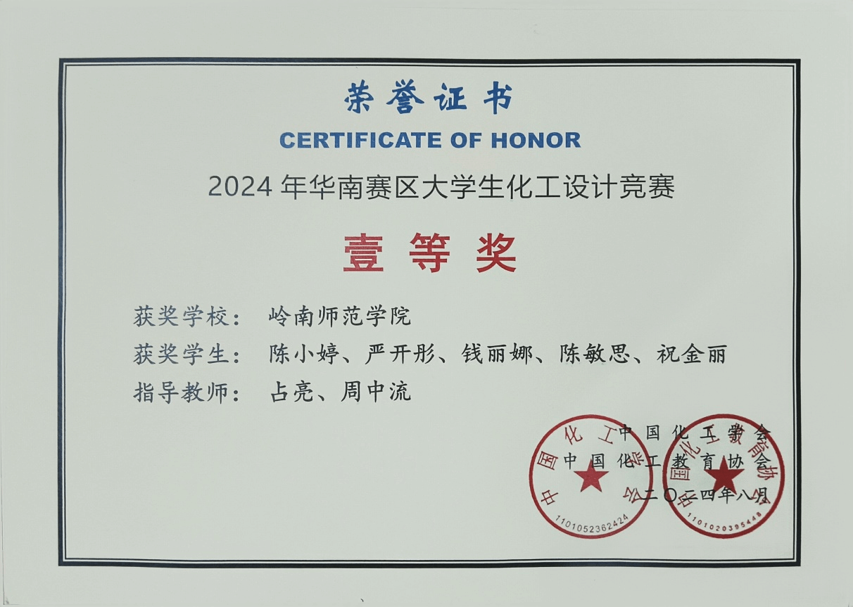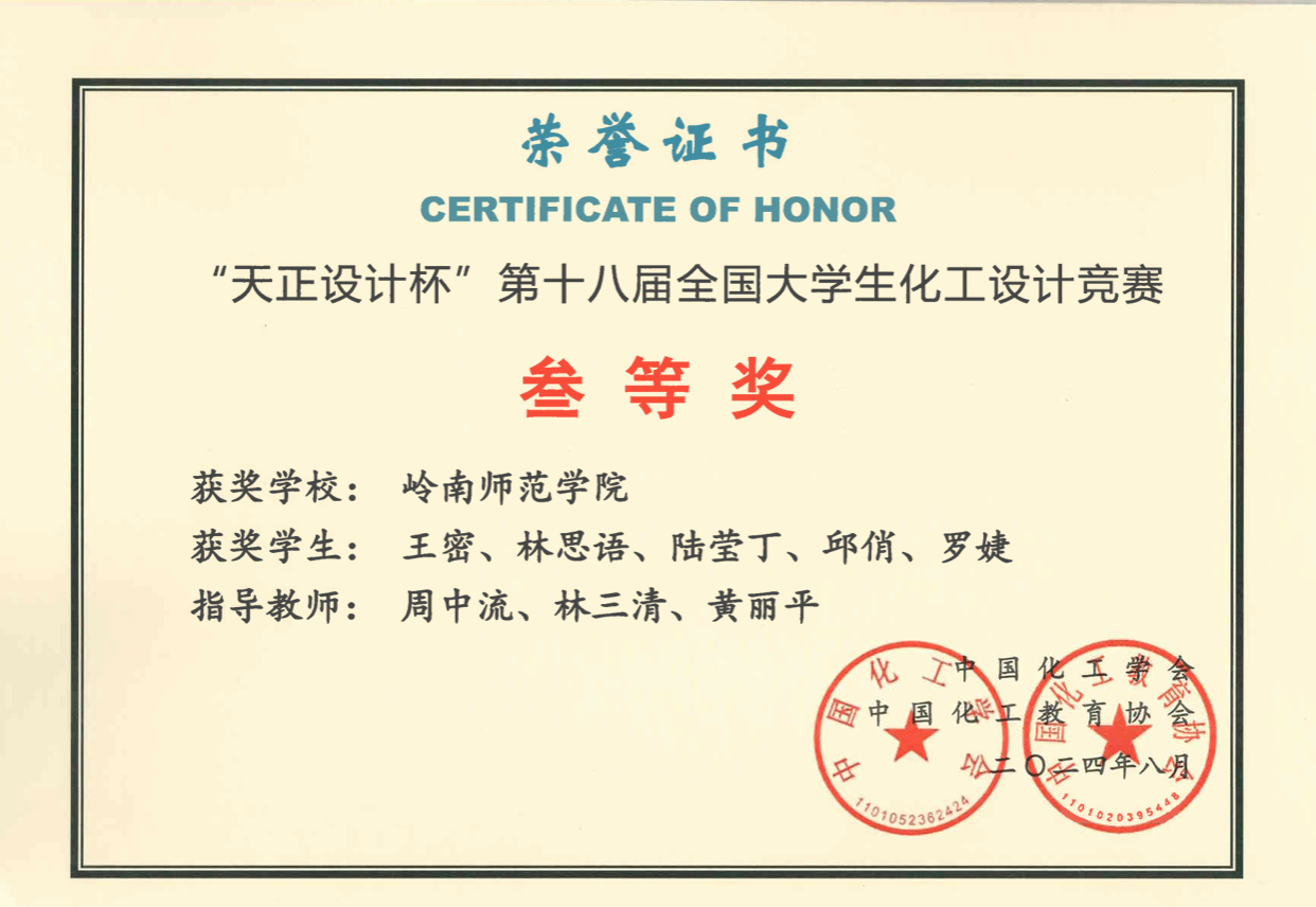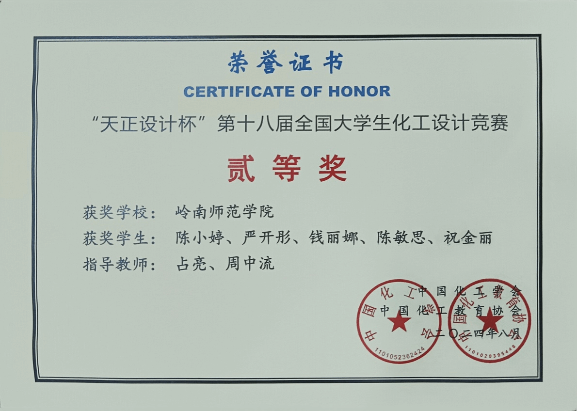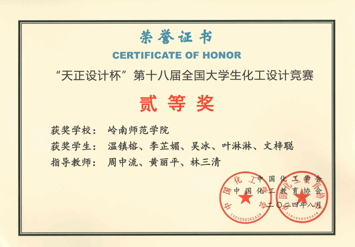 近日,由中国化工学会、中国化工教育协会主办的2024年“天正设计杯”第十八届全国大学生化工设计竞赛在大连理工大学落下帷幕。我院学子获得全国二等奖2项,全国三等奖1项,华南赛区一等奖1项。