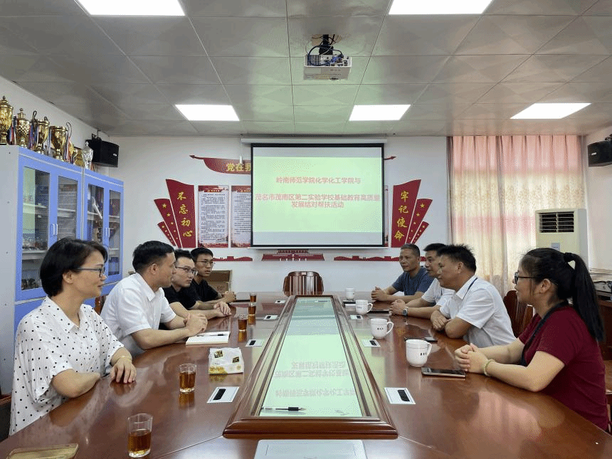 为深入贯彻落实省委省政府关于推动基础教育高质量发展决策部署、省教育厅关于基础教育结对帮扶工作,我院与茂名市茂南区第二实验学校、吴川市振文中学结为对口帮扶学校,结对赋能助力粤西地区基础教育高质量发展。6月19日,化学化工学院周小松院长、晏蜻主任、薛茗月教授、彭兰贞老师、林雨衍老师等一行五人,到茂名市茂南区第二实验学校和吴川市振文中学开展教育帮扶活动。