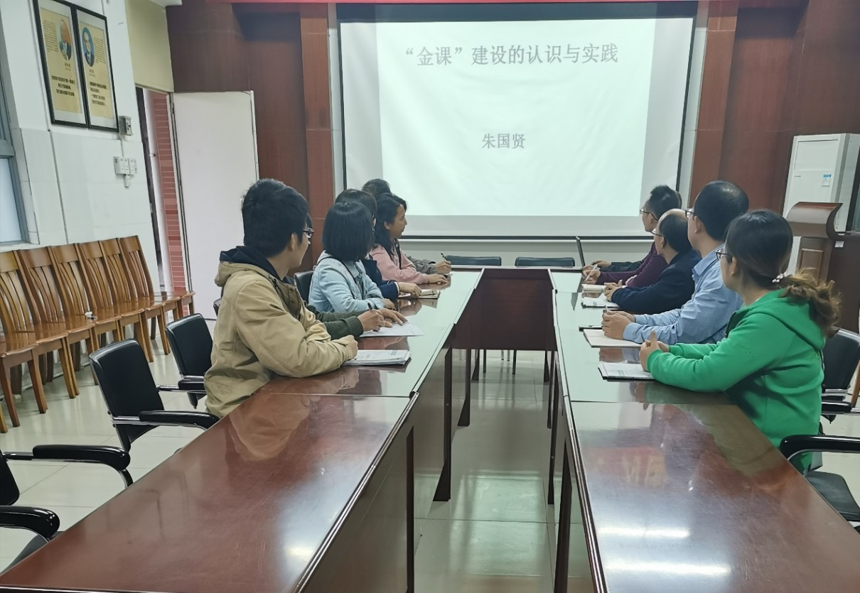 朱国贤副处长在我院会议室作了《“金课”建设的认识与实践》的主题发言。他在报告中首先介绍了新时代全国高等学校本科教育工作会议的内容和教育部发布的相关文件要求,强调要坚持“以人为本”,推进“四个回归”,建设有高阶性、创新性和挑战度的“金课”。朱国贤副处长结合自己的教学经验,总结了自己对“金课”建设的认识,并以项目“以学生为中心的《无机化学》课程教学研究和改革实践”(2019年省厅立项项目)为例,从教学理念、教学内容、课程标准、教学模式、交流平台和考评体系等方面全面、具体的介绍了“金课”建设的实践。