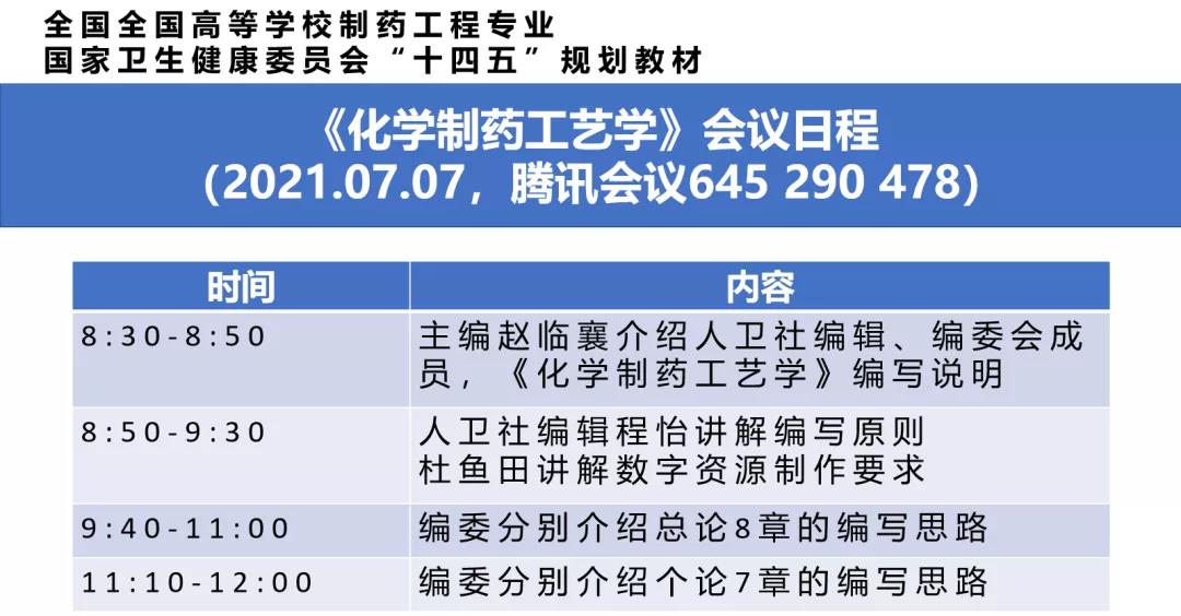 近日,人民卫生出版社《化学制药工艺学》教材编委会在腾讯会议顺利召开,该教材为沈阳药科大学赵临襄教授主编的国家卫生健康委员会“十四五”规划教材,全国高等学校制药工程专业第二轮规划教材。本次会议主题主要是明确新版教材的特色和定位,明确编写原则和附带文件的制作规程,议定教材各章节内容,商定编写进程的时间节点。来自沈阳药科学、贵州大学、广西中医药大学、安徽中医药大学、宁波诺柏医药有限公司等10余名专家参加会议,我院教师周中流教授作为编委成员参加了本次会议。
