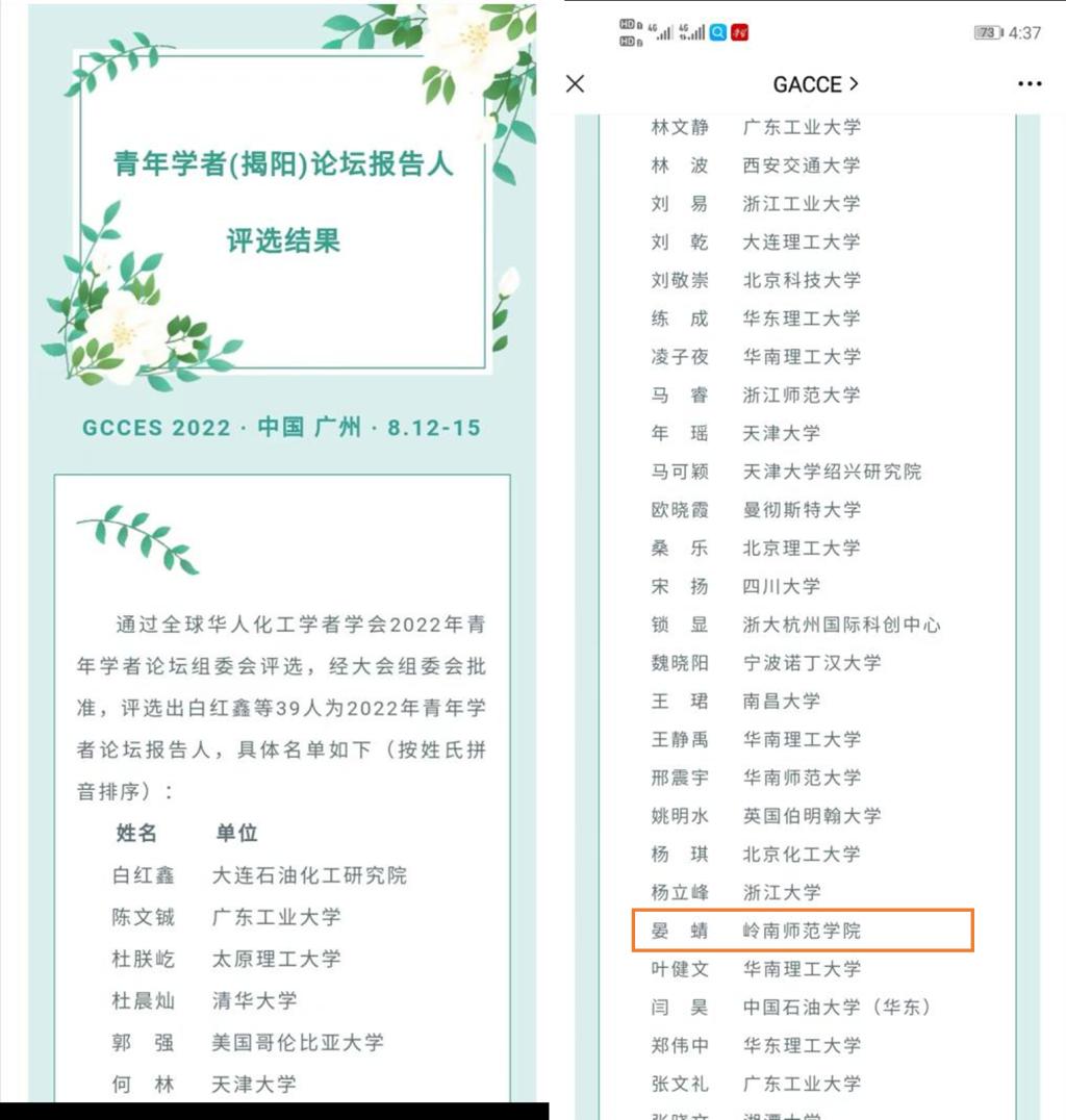 2022年由广东工业大学和华南理工大学共同承办的第十四届全球华人化工学者研讨会青年学者论坛拟于2022年8月11日在广东揭阳举行。本次研讨会重点关注(但不限于)以下学科方向:碳中和与碳达峰、生物质化工、精细化工、生物化工、分离与传递过程、化工过程强化、能源化学工程、材料化工、催化与反应工程、电子化学品、化工系统与智能工程、绿色化工制造。通过全球华人化工学者学会2022年青年学者论坛组委会评选,经大会组委会批准,评选出了来自海内外大学、研究院所的39位青年学者论坛报告人。岭南师范学院化学化工学院晏蜻博士成功入选第十四届全球华人化工学者研讨会青年学者论坛报告人。