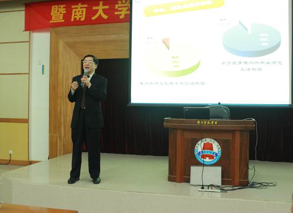 4月9日晚,由暨南大学敖宁建教授主讲,题为“暨南大学本科与研究生人才培养状况介绍”的报告会在图书馆学术报告厅举行。化学化工学院苗碗根副院长、夏加亮老师、苏文义老师及近300名学生聆听了本次讲座。报告会由冯宗财教授主持。