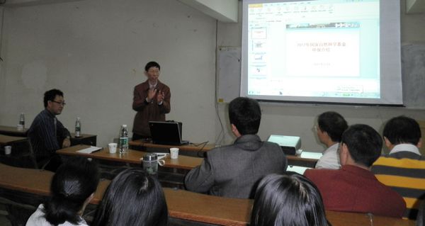 接着,彭教授开始讲解申报国家自然科学基金的相关事项。他从国家基金申报情况及项目类型、今年政策调整与变化、申报基金的经验总结等方面进行了讲解。他介绍了国家自然基金资助的增长趋势现状、经费比例情况,还具体地说明了集中申报类型与非集中类型的申报项目。最后他总结了在申报基金方面的经验。他认为要申报基金首先要潜心研究,加强积累,不断地扩大学术的影响;然后要加强后期管理,重视绩效评价,提前介入指南等。彭教授还特别对申请书撰技巧和策略作了详细的介绍,提醒老师们写申请书一定要对学科方向发展现状有充分的了解,要提出有建议性的问题并清楚解决这些问题的思路,注意逻辑关系、创新点以及预期效果的撰写。