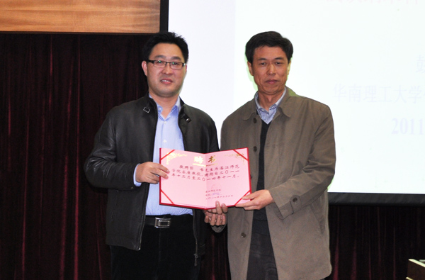 首先,莫院长对彭教授进行了简单的介绍。随后,我校邵乐喜副院长致辞,他对彭教授的到来以及华南理工大学对我校教育事业一直以来的关注和支持表示了衷心的感谢。之后,邵副院长为彭教授颁发证书,彭峰教授正式被聘任为我校客座的教授。