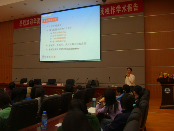 2009年4月3日下午,学校综合实验楼A栋一楼国际报告厅里座无虚席,掌声阵阵。华南理工大学副校长、博士生导师李琳教授在此作了一场精彩的学术报告。科学与技术研究处处长李小戈、化学科学与技术学院院长莫春生、党委副书记冯宗财等领导出席了本次报告会。