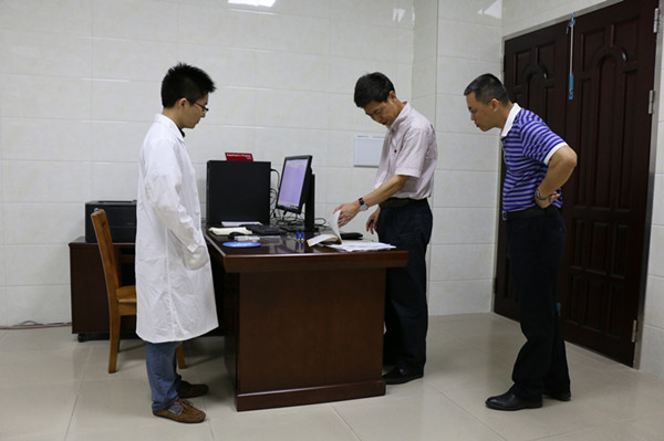 邵副院长首先参观了刚刚建成的核磁共振仪器室,向仪器管理员详细了解核磁仪器的运作情况及仪器管理问题,并对仪器的管理和提高使用效率等问题提出了具体的指导意见。随后,邵副院长对实验教学示范中心的教学与管理工作进行检查,与上课教师和管理人员进行了交流,参观了实验楼新建的文化设施,对实验教学示范中心的教学、科研、安全管理、文化建设给予了充分的肯定,对进一步加强实验教学示范中心的建设、管理提出改进意见,希望实验教学示范中心做好充分准备,迎接今年省教育厅的实验室安全管理检查工作。检查过程中,邵副院长也对化学化工学院利用现有的实验平台,加强科研成果产业化工作提出工作要求和指导意见。
