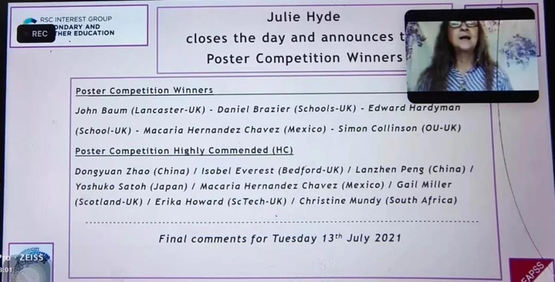 北京时间7月13 -14日,由英国皇家化学会主办的中学化学与继续教育研讨会和第十一届国际化学微型实验研讨会相继举行。受疫情影响,本届国际会议改为线上会议。据组委会通报,本次会议有多个国家参与共170余人注册参会。会议官方网站共展览20余篇墙报,我国专家学者占9篇,其中化学化工学院教师代表彭兰贞、沈戮、谢木标共同撰写的墙报喜获入选。