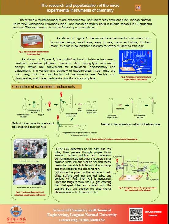 会上,我国赵东洋和彭兰贞两位老师的墙报得到组办方委员会的大力表扬,这是对我院长期研发、推广化学微型实验工作的肯定和嘉奖。新课改要求下强调培养学生的化学学科核心素养,在师范生课程当中开设中学化学微型实验,有利于师范生适应我国基础教育课程改革提出的要求,提高师范生职后的核心素养培养意识,增强化学教学教研能力。化学化工学院将继续为中国ML体系的构建,高素质创新性人才培养谱写新篇章。