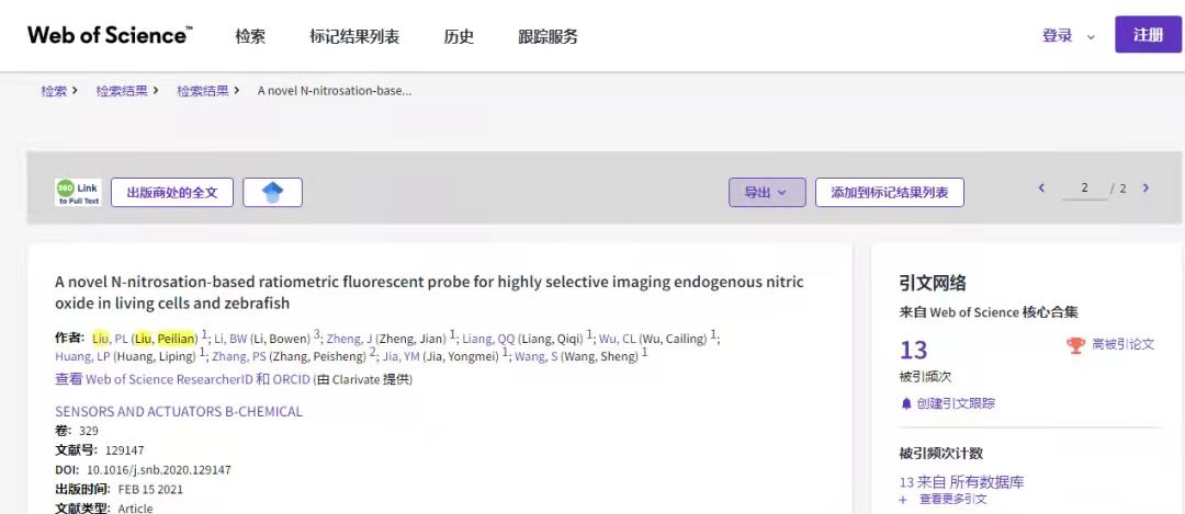 近日,化学化工学院制药工程专业教师刘培炼博士在传感器领域的国际权威期刊Sensors and Actuators: B. Chemical(SCI一区top期刊)题为《A novel N-nitrosation-based ratiometric fluorescent probe for highly selective imaging endogenous nitric oxide in living cells and zebrafsh》的研究论文被引频次进入全球Chemistry学术领域Top 1% 之列。