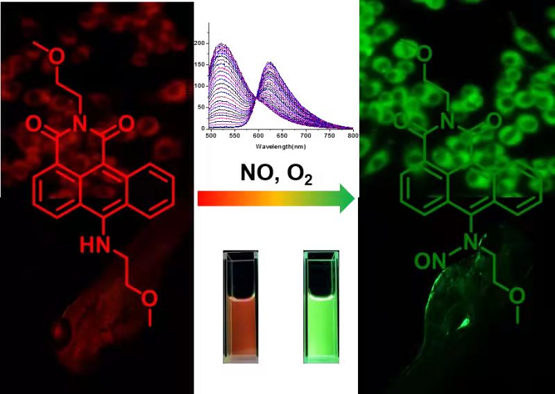 一氧化氮(NO)是一种广泛存在于机体中的信号转导分子,在机体的许多病理生理过程中起着重要作用。NO异常水平与肿瘤、心脑血管疾病、神经退行性疾病等多种疾病密切相关。因此,在细胞和体内检测NO对于相关疾病的化学生物学研究具有重要意义。为了实现NO的快速、高选择性、比色及荧光比率检测,本研究设计合成了以蒽酰亚胺为荧光团、以芳仲胺为识别基团的新型荧光探针。探针对NO具有良好的比率型荧光响应性(I525/I625)和很高的灵敏度(检测限达到4.05 nM);该探针在生理环境的各种干扰物存在下以及生理pH范围内对NO的检测具有很好的选择性及响应性。更重要的是,该探针能够对细胞及斑马鱼活体中内源性NO进行灵敏的标记。本工作中探针的设计策略能为实用型的比率NO荧光探针的设计及应用提供有益的参考。