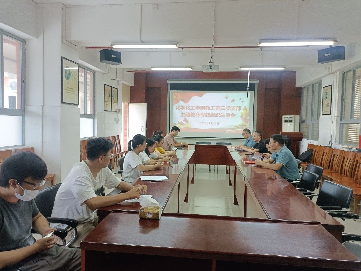 根据学校党委《关于认真开好“学习贯彻习近平新时代中国特色社会主义思想”专题组织生活会的通知》,聚焦“学思想、强党性、重实践、建新功”总要求。9月13日下午,化学化工学院教工第三党支部在学院会议室开展主题教育专题组织生活会,会议由党支部书记罗金主持,支部全体党员参加,学院副院长周中流同志以普通党员身份参加会议并进行点评。