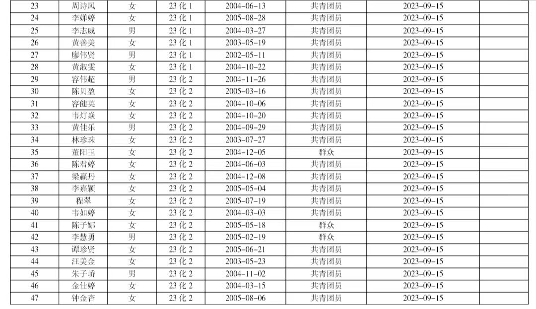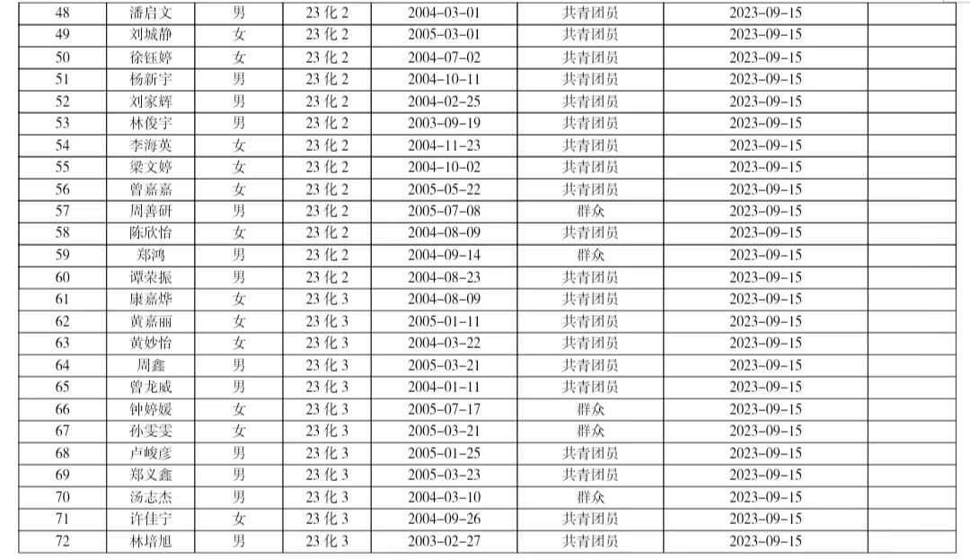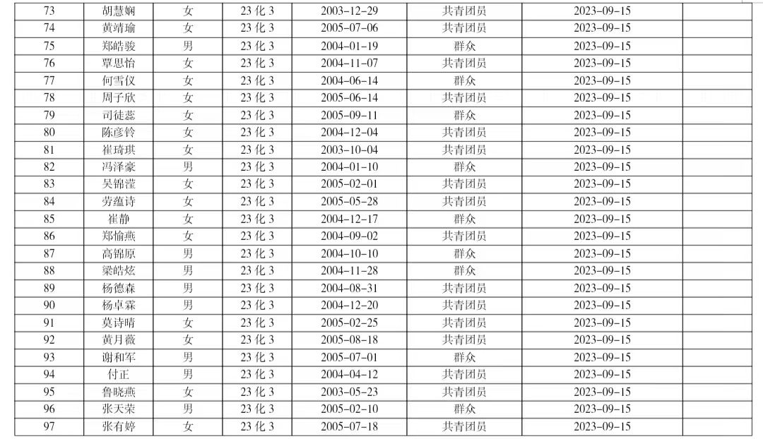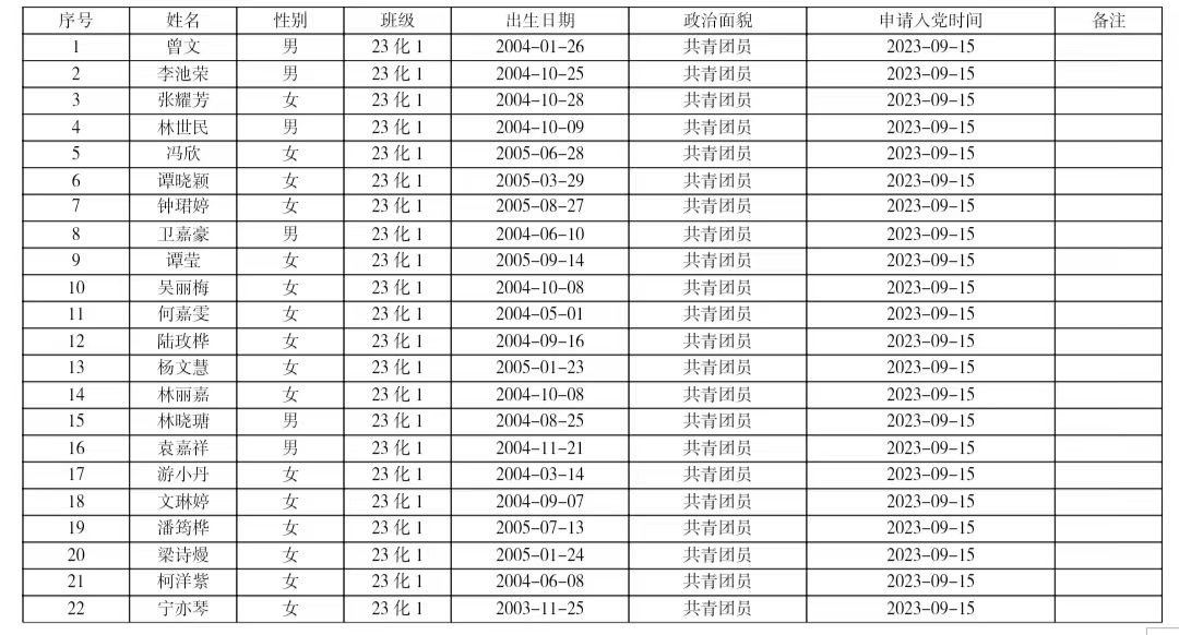 根据《中国共产党发展党员工作细则》规定,现有化学化工学院23化学1班曾文等109名同志按要求向学院党组织自愿递交了入党申请书。现将其有关情况予以公示,征求党员、群众意见。