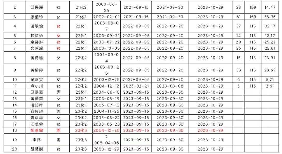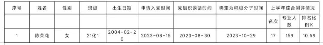 根据《中国共产党发展党员工作细则》规定,经本人提出申请,团组织推优,在听取培养联系人、党员和群众意见的基础上,经支部委员会集体讨论研究决定,拟将21化学1班陈荣花等20名同志确定为入党积极分子。现将其有关情况予以公示,征求党员、群众意见。