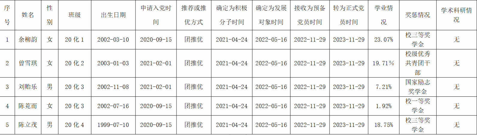 根据«岭南师范学院发展党员工作细则»规定,经本人提出申请,党组织培养考察,支委会审查研究决定,上级党委(党支部)预审通过,支部大会讨论同意,20化1余柳韵等5名同志拟按期转为中共正式党员。现将其有关情况予以公式,征求党员、群众意见。