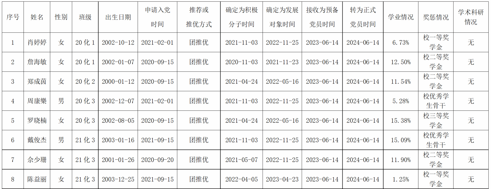 根据«岭南师范学院发展党员工作细则»规定,经本人提出申请,党组织培养考察,支委会审查研究决定,上级党委(党支部)预审通过,支部大会讨论同意,20化学1班肖婷婷等8名同志拟按期转为中共正式党员。现将其有关情况予以公式,征求党员、群众意见。