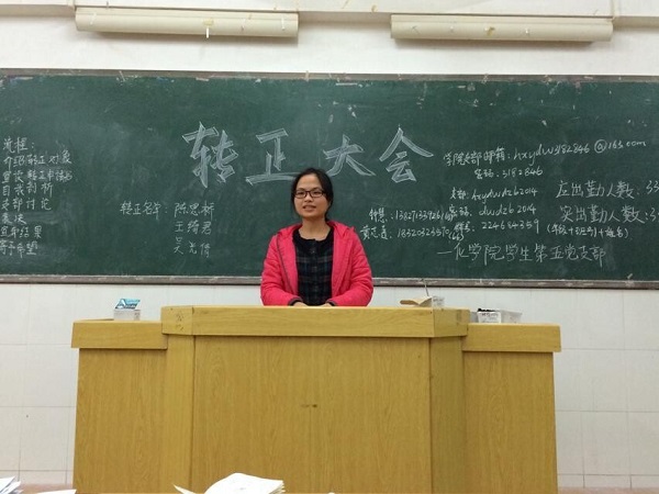 第五党支部书记钟慧宣布党员转正大会正式开始,党员转正代表陈思桥宣读了转正申请书,随后,另外两位预备党员向组织详细汇报了自己在预备党员期间的表现,表达了其入党的志愿和决心,并对自己的思想、学习、工作和生活作了认真的汇报,指出自己在这一年里面的进步和依然存在的问题。同时也介绍了自己在这一年里面对党的深入认识和了解,以及在今后学习、工作中如何彻底落实党的宗旨。最后支部全体党员通过举手表决的方式,一致同意陈思桥等三名同志转为中共正式党员,学生党支部书记钟慧同志向全体与会同志宣布支部大会对预备党员转正的决议。