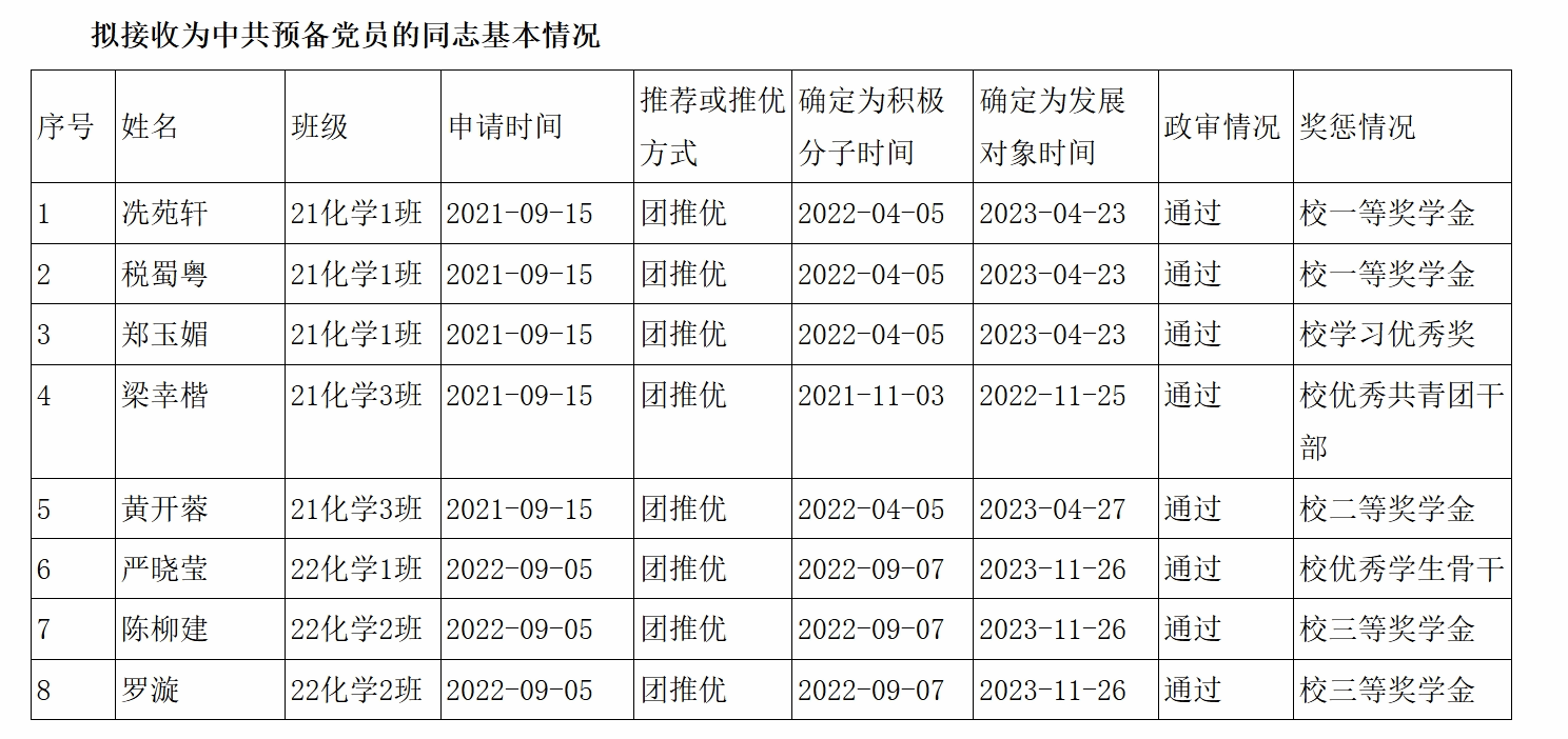 根据《中国共产党发展党员工作细则》规定,经本人提出申请,党组织培养考察,支部审核(结合综测成绩、支部贡献、支部民意、干部工作、领导老师评议打分等情况),学院党委会研究通过,拟接收21化学1班冼苑轩等8名同志为中共预备党员,现将有关情况予以公示。