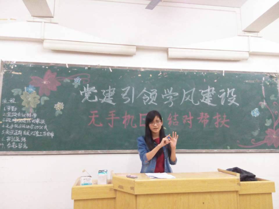会议开始后,主持人黄椅梅宣读了会议精神,再次强调了党员模范作用的重要性。在团员结对帮扶环节中,大家很积极地参与发言,一一讲述了自己帮扶的对象。接下来是无手机日活动的启动仪式,周翠柳同志的带领其他成员,郑重地许下往后合理使用手机的承诺。党支部书记黄丹颖则详细地讲解了党员发展的整个过程及接下来的党支部活动安排。