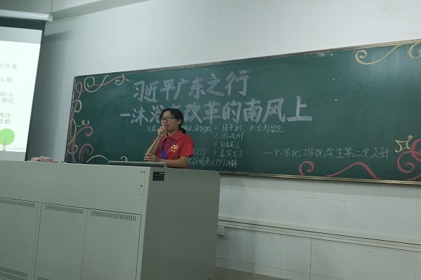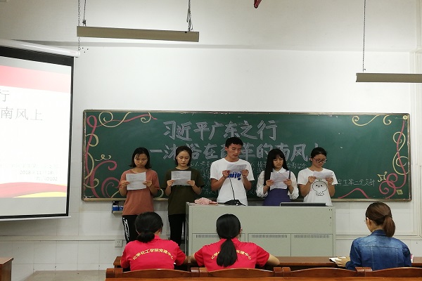 为认真学习贯彻习近平总书记视察广东重要讲话精神,深刻认识习近平总书记视察广东重要讲话精神的重大政治意义,11月18日晚,化学化工学院学生第二党支部在燕雷楼D栋102室召开以“习近平总书记广东之行——沐浴在改革的南风上”为主题的组织生活会议。化学化工学院学生第二党支部陈艳君老师、党建中心干部杨雪清和陈巧璇以及第二党支部成员出席本次会议。