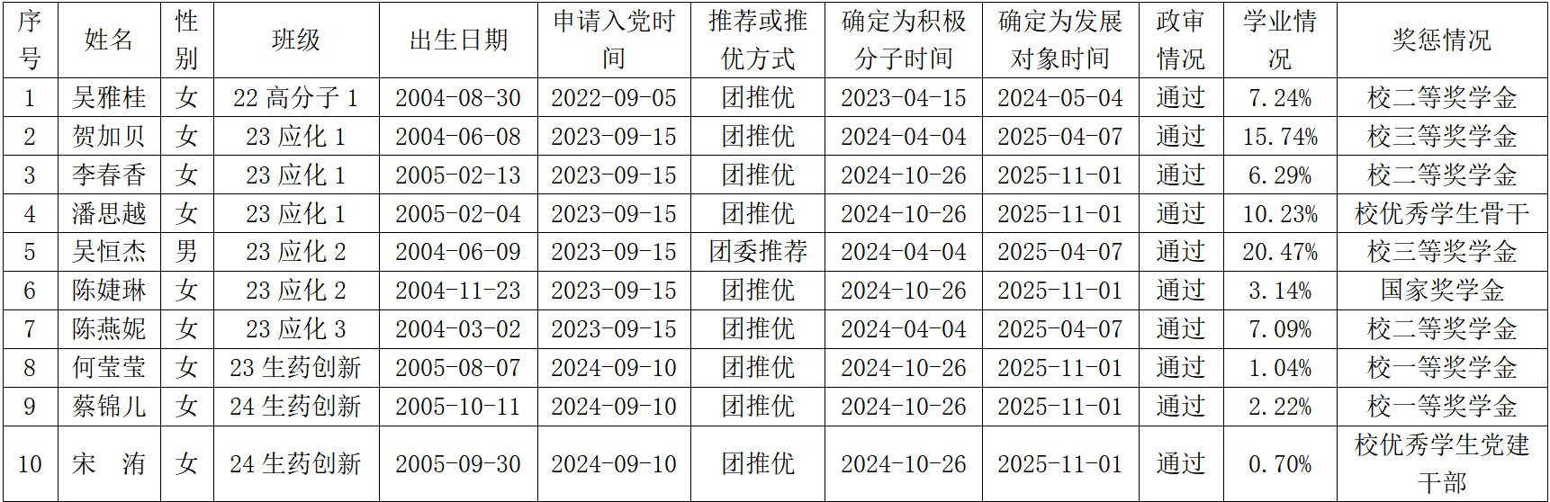 根据《中国共产党发展党员工作细则》规定,经本人提出申请,党组织培养考察,支委会审查研究,学院党委预审通过,现将其有关情况予以公示,拟接收22高分子1班吴雅桂等10名同志为中共预备党员,征求党员、群众意见。