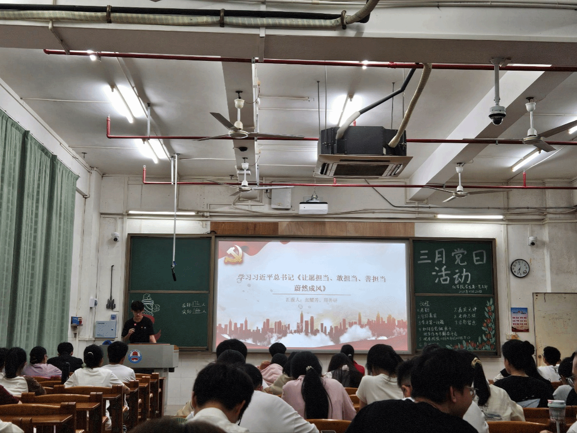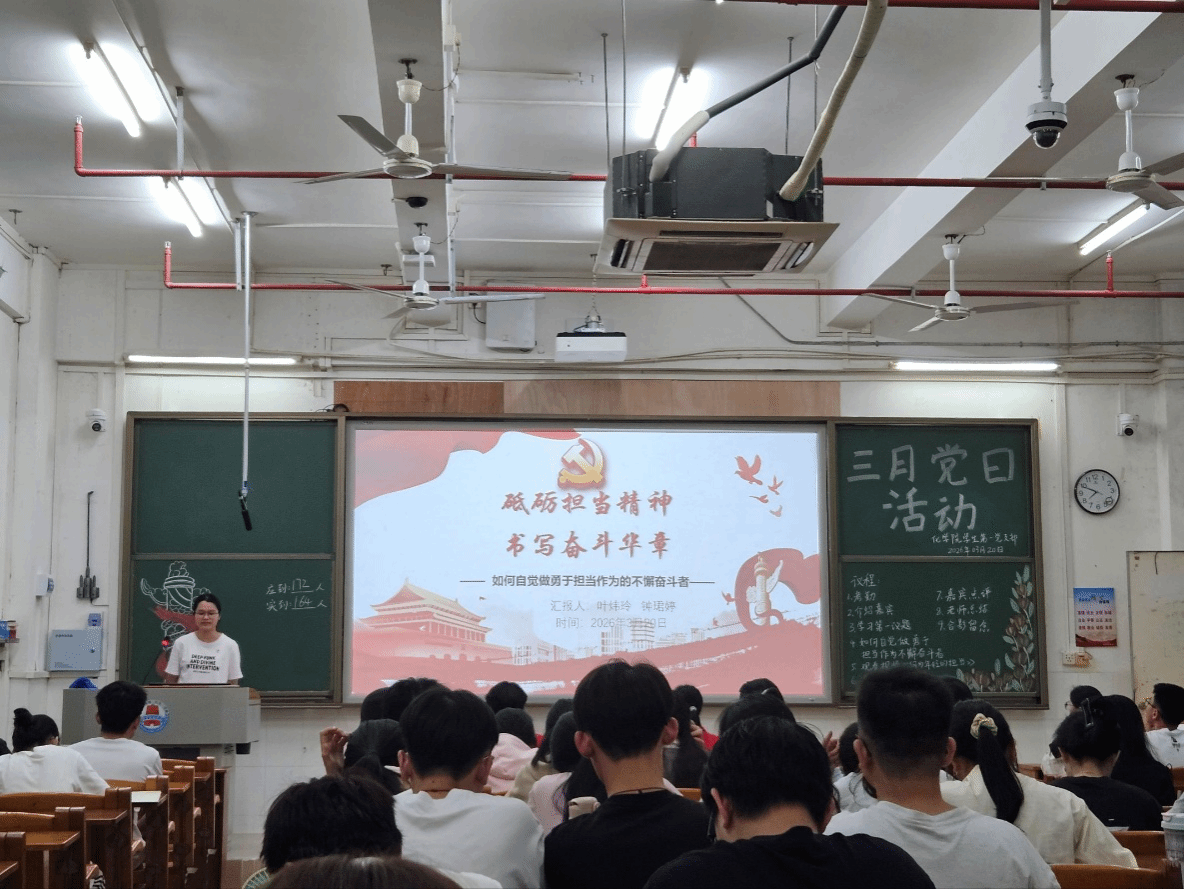 3月20日晚上19:30,化学化工学院学生第一党支部以“挺膺担当,不负时代”为主题在教四C-105开展三月份党日活动。旨在引导支部成员深刻理解担当精神核心内涵,明晰实践路径,将挺膺担当融入日常学习与实践,以实际行动诠释新时代青年的责任与使命。