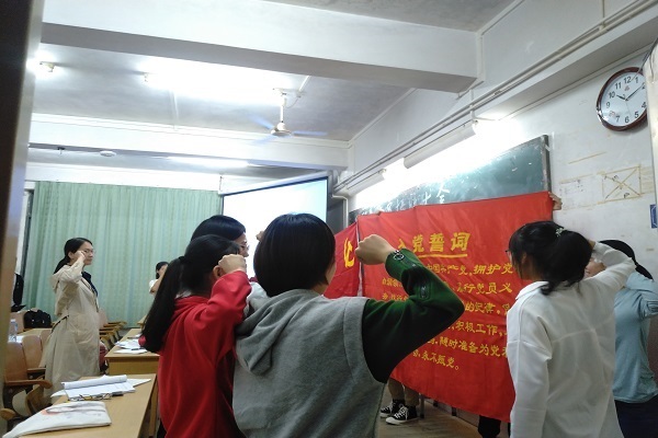 其后调查人员通过在会议前对候选人相关情况的调查,宣读相应候选人的调查结果,并根据调查结果进行提问、点评及提出建议。调查人员就近期政治知识问题对候选人进行提问,通过一问一答的形式,帮助他们发现不足,加强学习,提高政治素养。入党介绍人介绍候选人的现状和培养考察情况,进一步地让在场的支部成员对各位候选人有了更加准确的印象。同时,他们还对其能否入党表明自己的意见和态度,希望他们能够发扬优点、克服缺点、继续学习、不断努力。陈菲宇同志作为预备党员代表宣读入党志愿书。在入党宣誓中,杨来娣同志领誓,所有党员右手握拳举起宣誓。通过对党庄严宣誓,新党员将继续秉承对党忠诚、为人民服务的态度,牢记党的宗旨,继续砥砺前行。