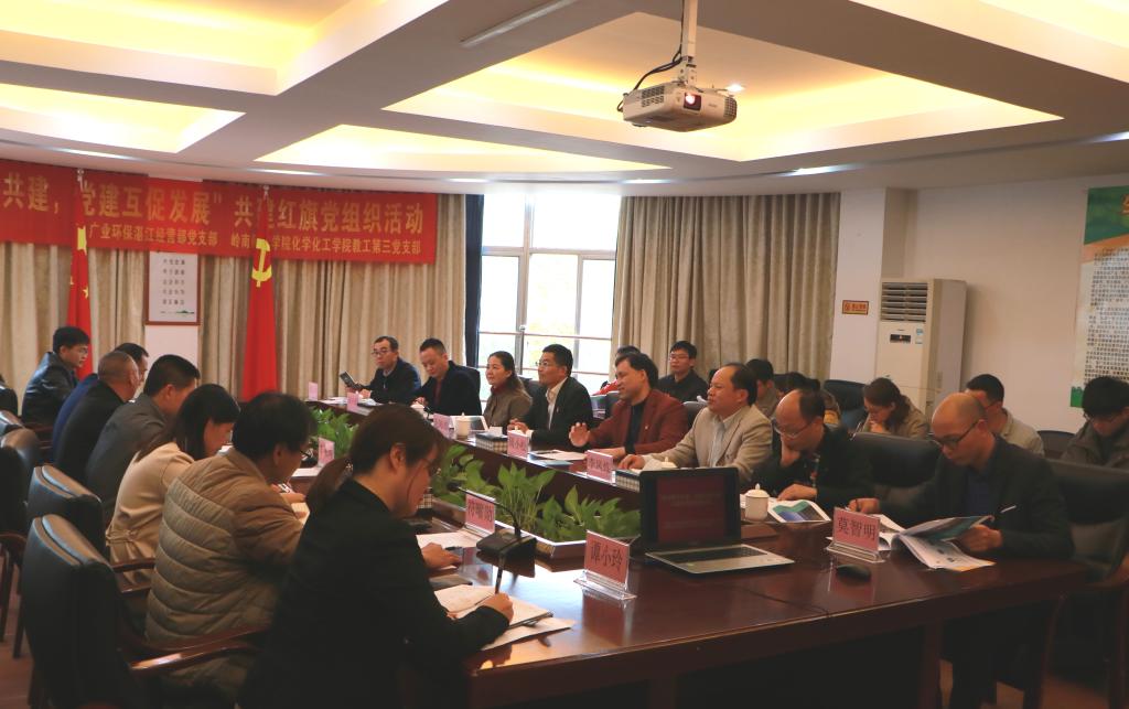 化学化工学院党委书记赵海波表示,党建+校企共建是巩固推进“不忘初心、牢记使命”主题教育常态化制度化的有效途径,是带动党员更好地了解湛江、学习湛江、研究湛江、服务湛江的重要抓手,拟以共建红旗党组织为切入点,努力实现党建共建互促、业务发展互助、人才培养合作。学院院长周小松介绍了学院办学发展情况,指出化学化工学院师资力量雄厚,人才培养质量优良,科研助推清洁能源研究等合作进展顺利,专业学科密切对接地方经济社会发展需求;建议双方不断拓展共建领域方式,努力实现党建+校企内外联动、优势互补、资源共享、协作共赢。学院党委副书记李凤炼,副院长周中流、谢木标等分别从打造“党建+”融合体助促就业实践、教学实习、科研实验等内容与广业环保产业集团有限公司湛江分公司各部门经理进行深入交流;畅谈党建+校企共建可产生强大合力,将党的政治优势、组织优势和群众工作优势,转化为服务地方经济社会发展、服务校企及广大党员群众的实际推动力、助推器。
