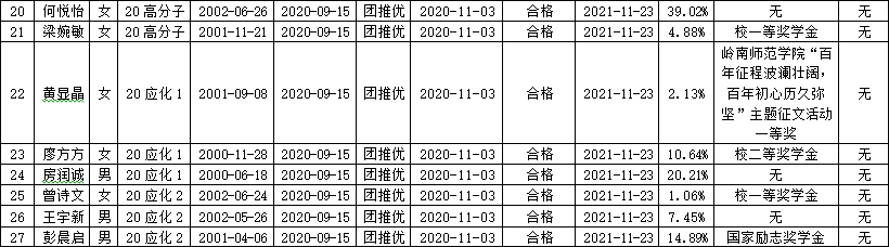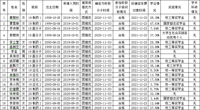 根据《中国共产党发展党员工作细则》规定,经本人提出申请,党组织培养考察,听取培养联系人、党员和群众意见,支部委员会研究决定,拟确定化学院18制药1班黄慧枚等27名同志为党员发展对象并报上级党委预审。现将其有关情况予以公示,征求党员、群众意见。