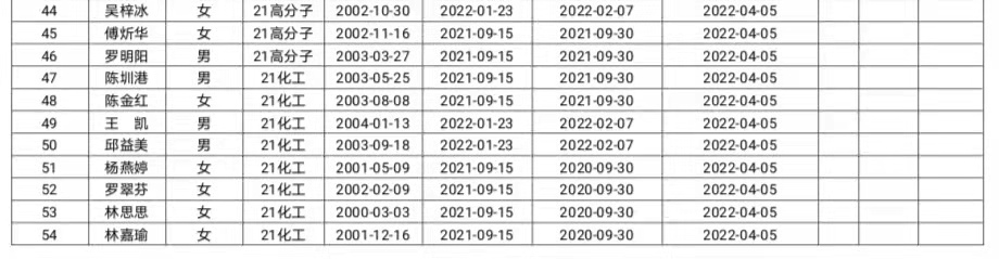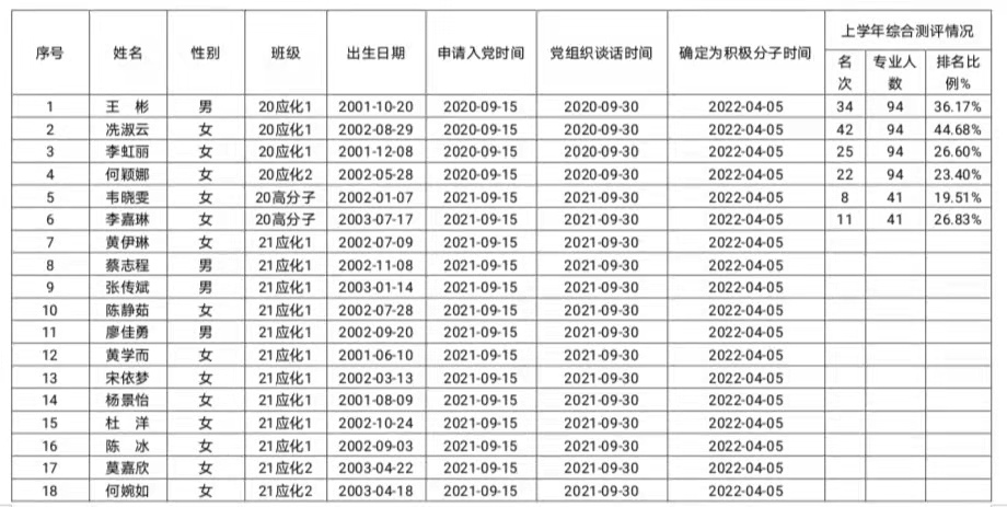 根据《中国共产党发展党员工作细则》规定,经本人提出申请,团组织推优,在听取培养联系人、党员和群众意见的基础上,经支部委员会集体讨论研究,拟将20应化1班王彬等54名同志确定为入党积极分子。现将其有关情况予以公示,征求党员、群众意见。