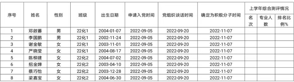 根据《中国共产党发展党员工作细则》规定,经本人提出申请,团组织推优,在听取培养联系人、党员和群众意见的基础上,经支部委员会集体讨论研究决定,拟将22级化学1班邓啟蕃等8名同志确定为入党积极分子。现将其有关情况予以公示,征求党员、群众意见。