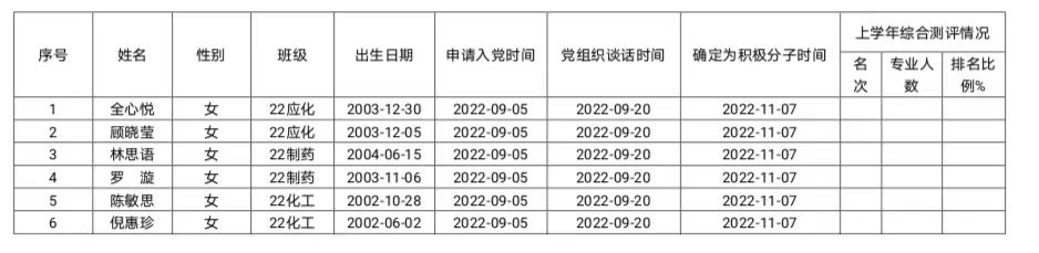 根据《中国共产党发展党员工作细则》规定,经本人提出申请,团组织推优,在听取培养联系人、党员和群众意见的基础上,经支部委员会集体讨论研究决定,拟将22级应化班全心悦等6名同志确定为入党积极分子。现将其有关情况予以公示,征求党员、群众意见。