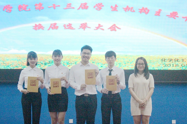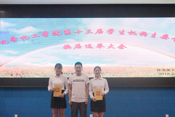 5月13日下午,化学化工学院于弘雷楼311室召开第十三届学生机构主要干部换届选举大会。出席本次大会的嘉宾有学院党委李梓副书记、辅导员陈艳君、柴乐浩、阮文科、张国强老师。