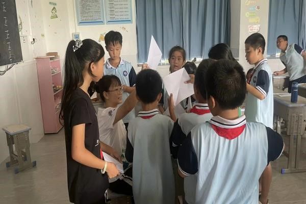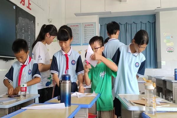 7月8日上午,“向日葵“社会实践队支教组的成员在湛江市坡头区南调中学的小学课堂上开展了折纸活动。