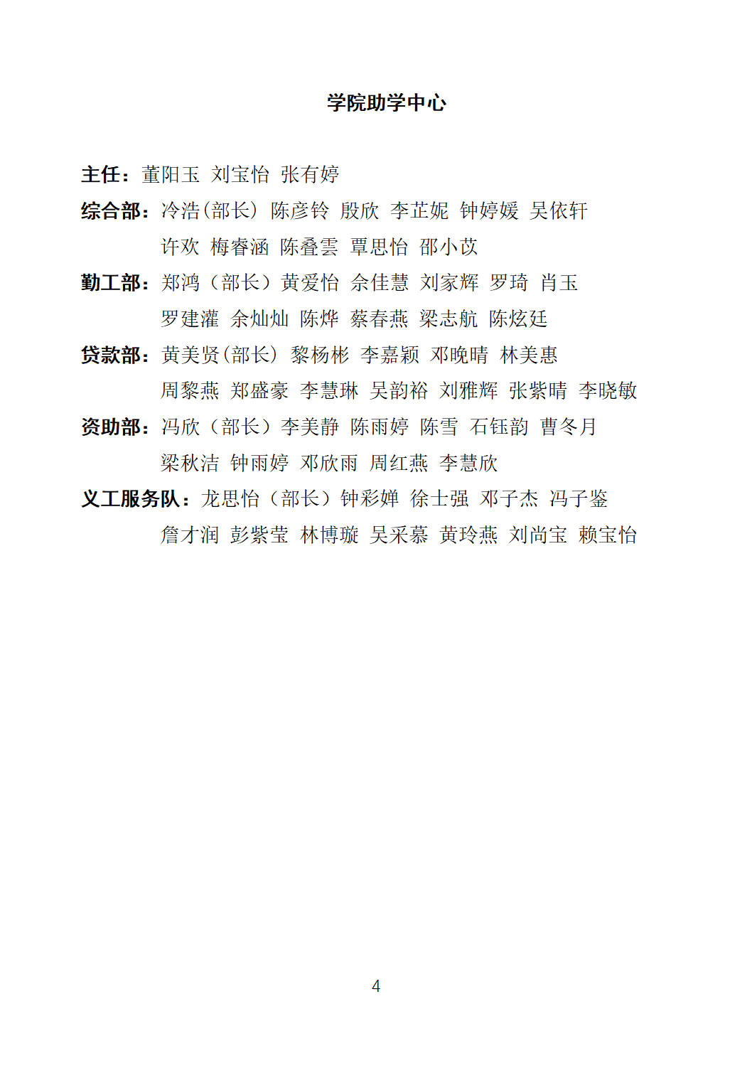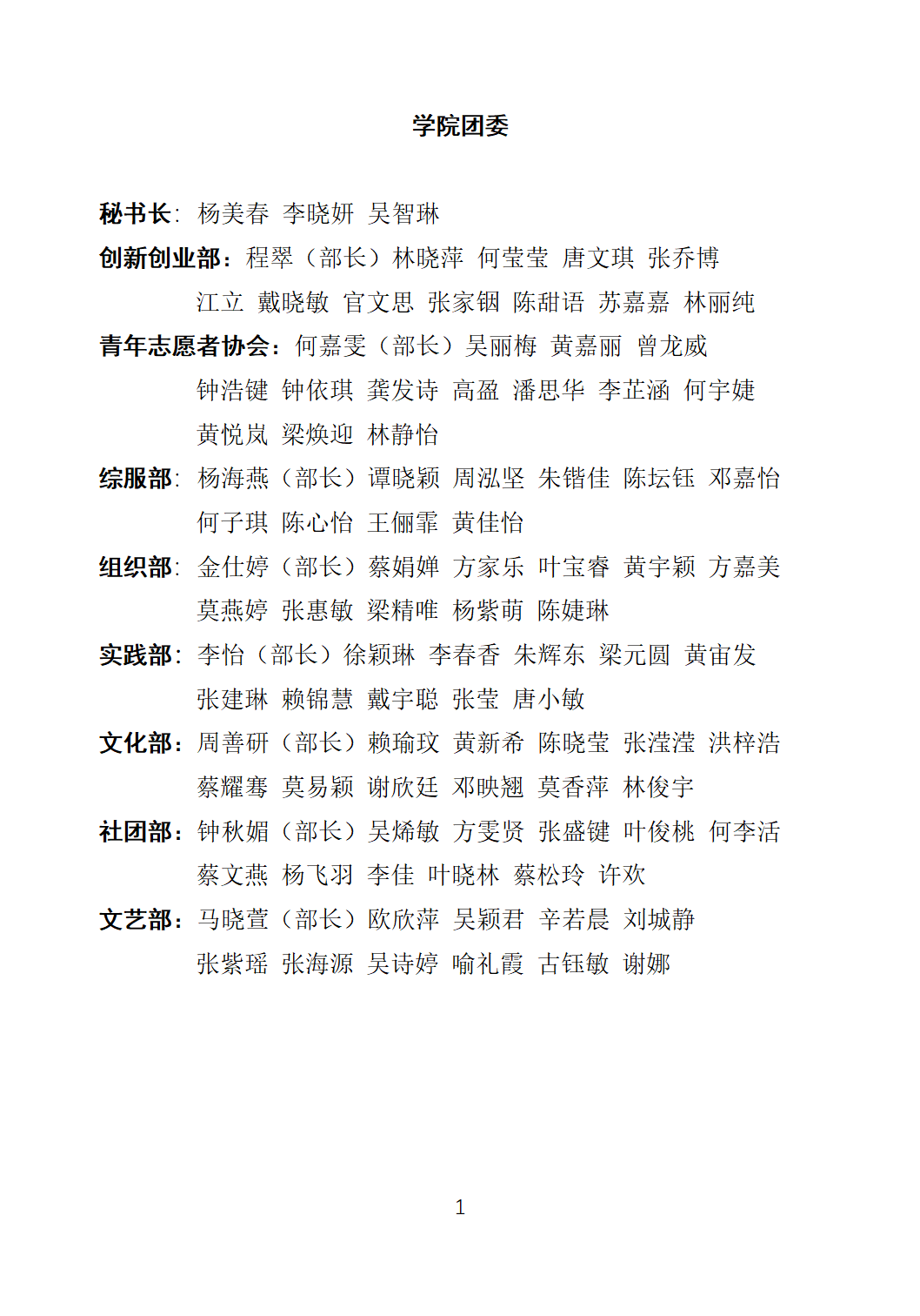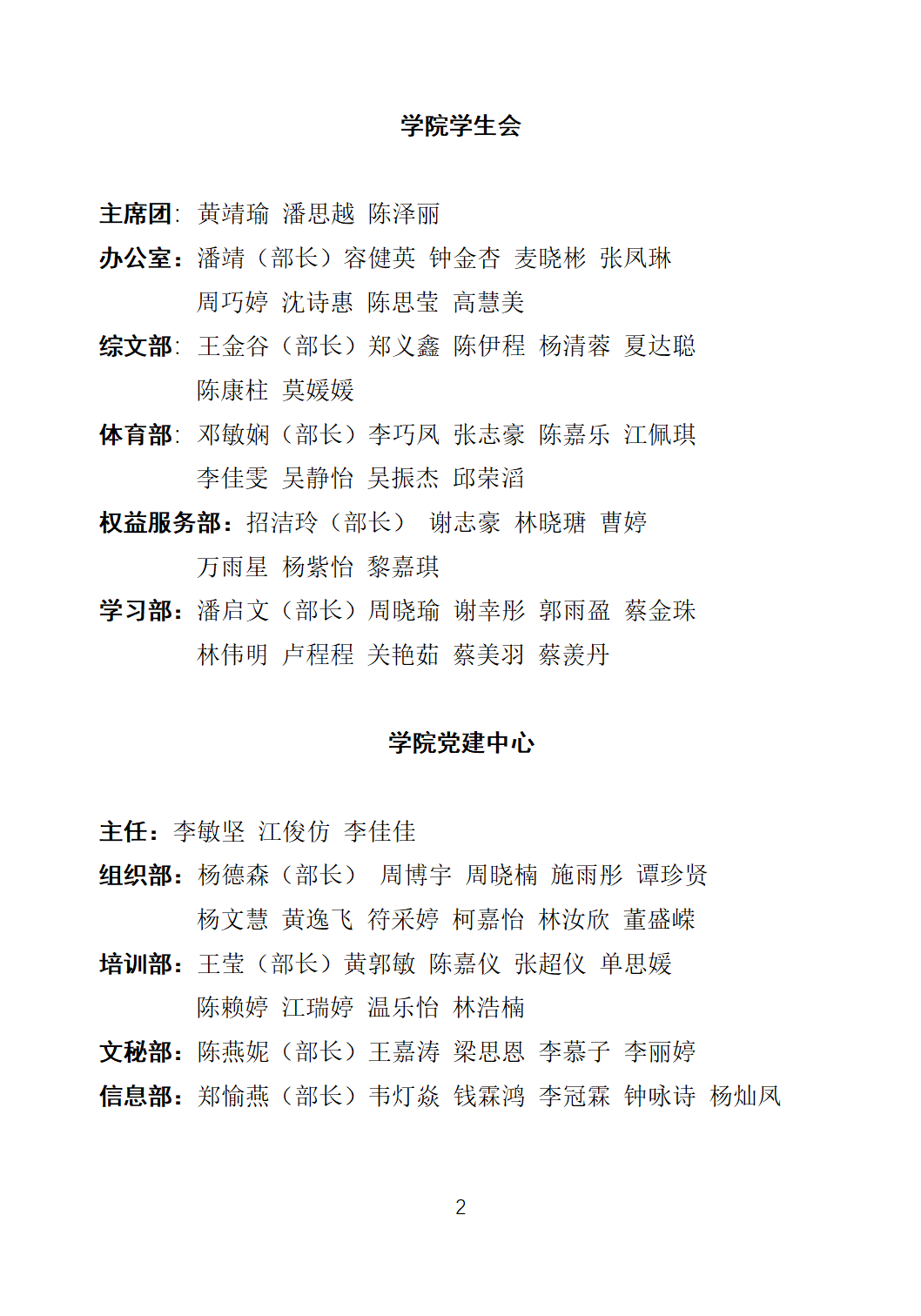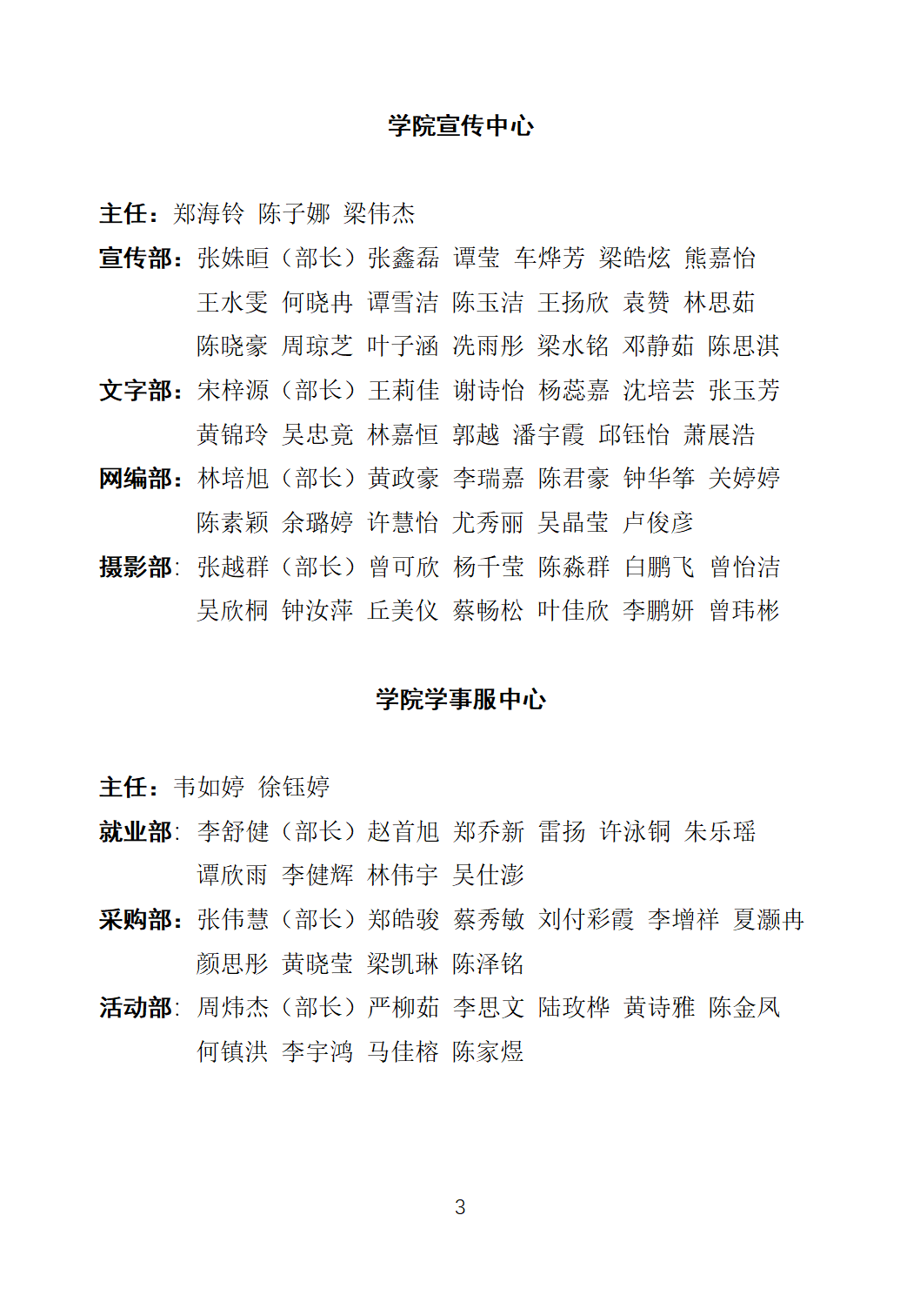 (各部门部长后的名单是部门副部长及部门干事若干;全体干部试用期为3个月)