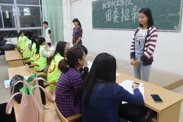 为了给学院干部团体注入新鲜的血液,吸纳有能力的人才,10月10日晚,化学化工学院团委、学生会、宣传中心、勤工中心四大机构于燕雷楼举行招新面试活动,面试地点主要设在二楼和三楼。此次招新主要面向化学化工学院2015级新生。