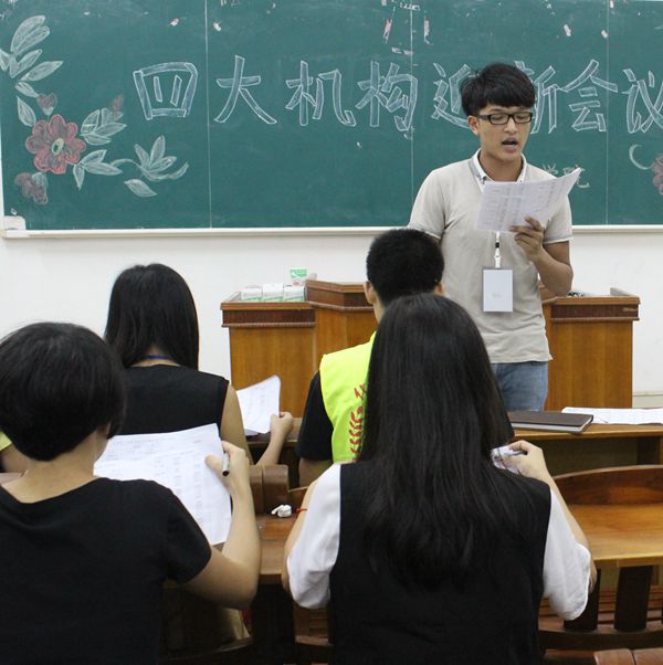 为了更好的迎接新生的到来,化学化工学院在9月4日晚于弘雷楼108室举行了四大机构的迎新会议。出席本次会议的嘉宾有学生会主席罗思凡、团委秘书长陈志鑫、勤工贷款中心主任林静婷、宣传中心主任陈斯斯以及四大机构各部门主要负责人。