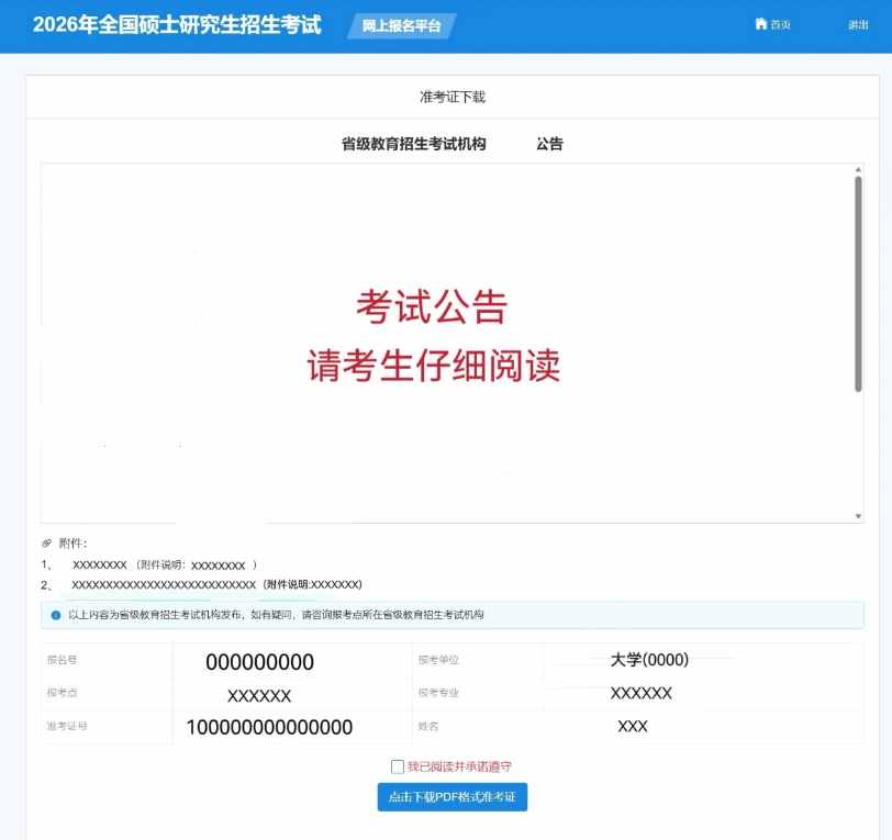 请各位考生一定耐心读完当前页面的所有提示,完成承诺勾选,再点击“下载PDF格式准考证”的按钮。