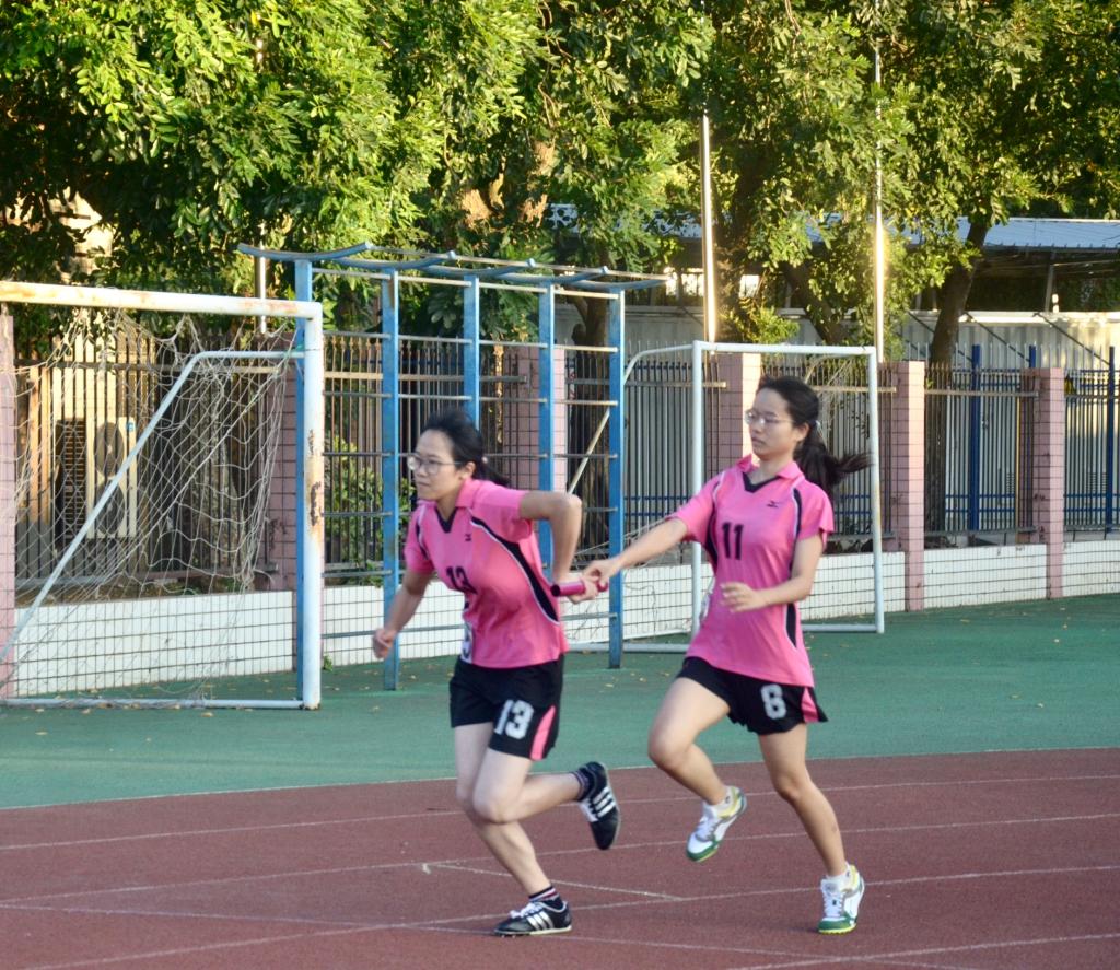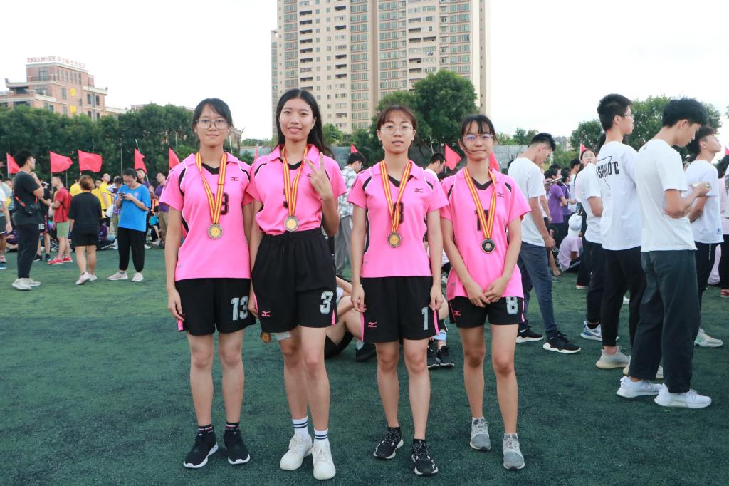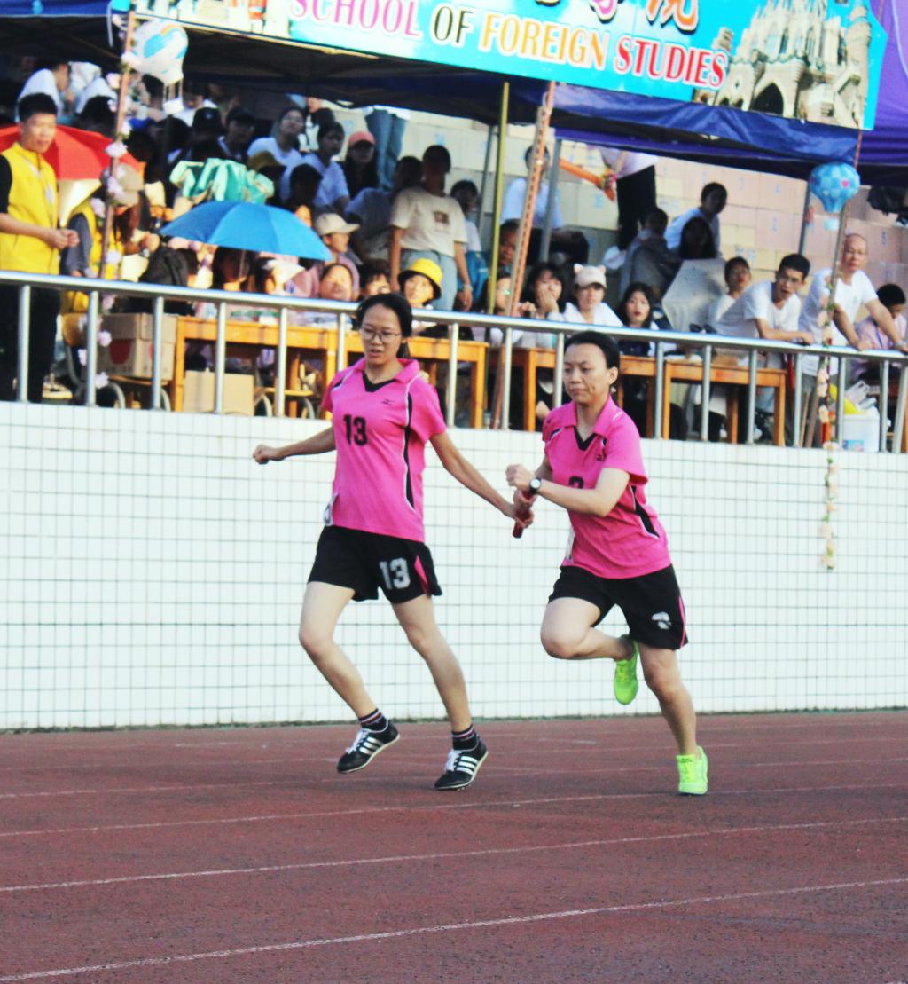 炙热的温度挡不住运动员们迸发的激情,红色的跑道映照着运动员们青春的身影。随着一声枪响,第一棒选手李诗韵迈着轻盈的步伐向前冲去,一握,一放,尽在一瞬间,传棒间信任与默契在无声的动作中得以体现。第二棒选手吕咏桃、第三棒选手何慧敏用尽全力拉开距离,风声、欢呼声都不如那一声声稳健的跑步声。当最后一棒传到黄雯彩手中时,她如一支离弦的箭径直地向终点冲去。最终团队以1分00.42秒的成绩荣获女子普通组4×100米接力赛季军。