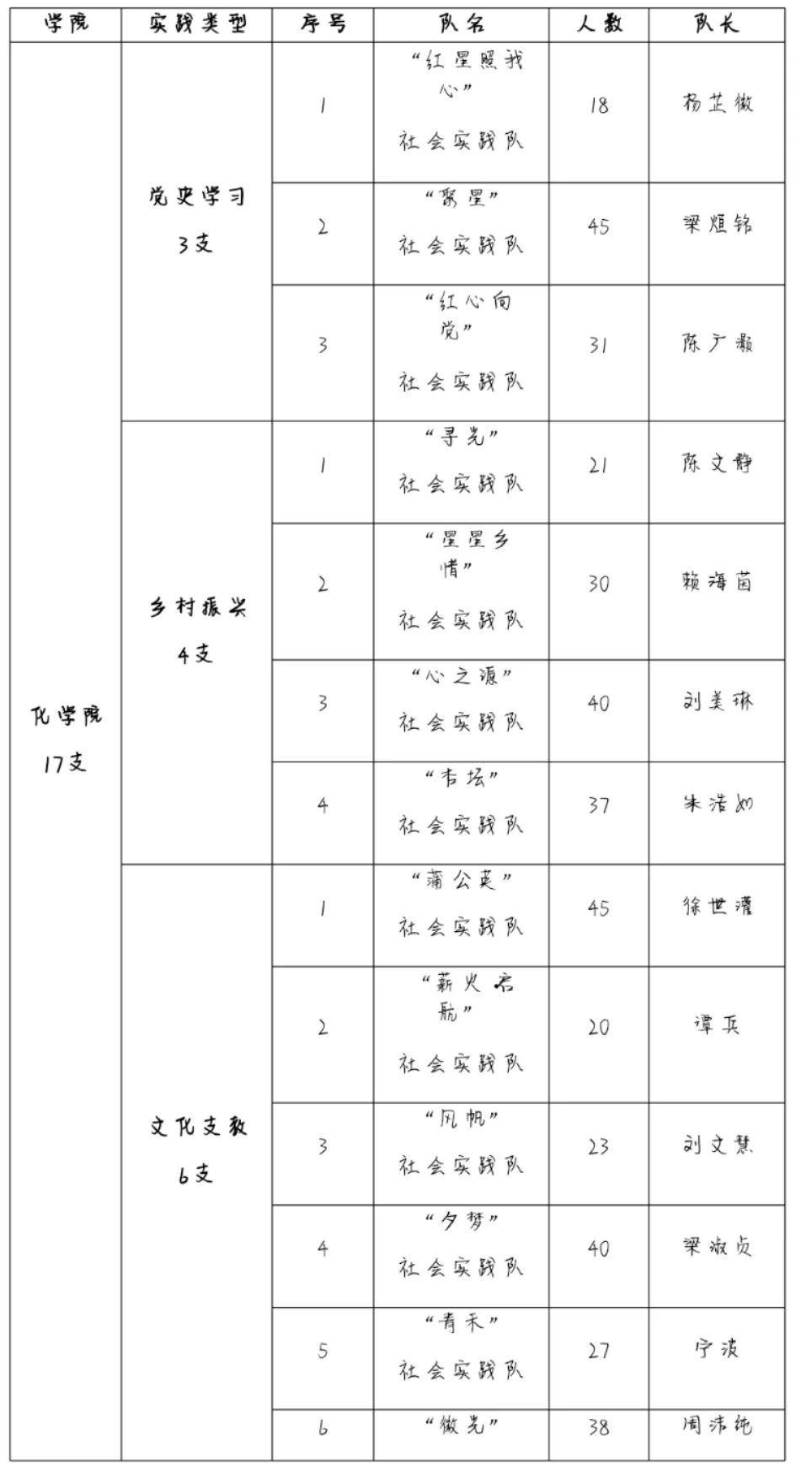 据统计,我院共组建了 17支队伍,由学院17位教师指导。其中党史学习队伍3支、乡村振兴队伍4支、文化支教队伍6支、课题调研3支、理论宣讲队伍1支,参与暑期“三下乡”社会实践活动人数目前为496人。