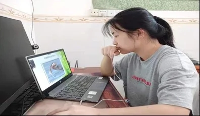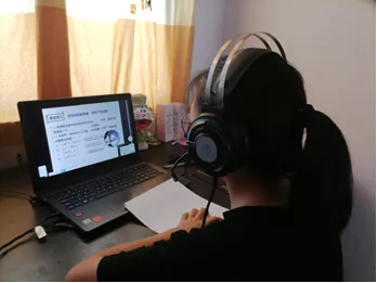 支教组成员叶媚辅导了生物知识。从视频中,我们可以看到她在周边环境十分安静的情况下,依旧选择以耳机为话筒,整个人时不时俯下身子去迁就耳机的高度,以给学生最好的听觉体验。她始终保持一种专业的教学态度,丝毫不被设备的问题所影响。她专心致志、目光如炬地讲解着PPT上的知识点。