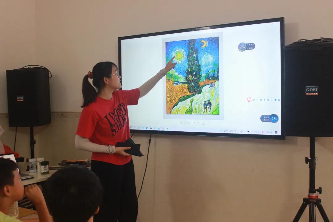 队员张可怡先是介绍了丙烯颜料:和水粉类似,不仅精美,安全无毒且附着力强。此外,给学生播放了丙烯颜料绘画的视频,这段视频充分展示了丙烯颜料绘画的灵活性和艺术性。