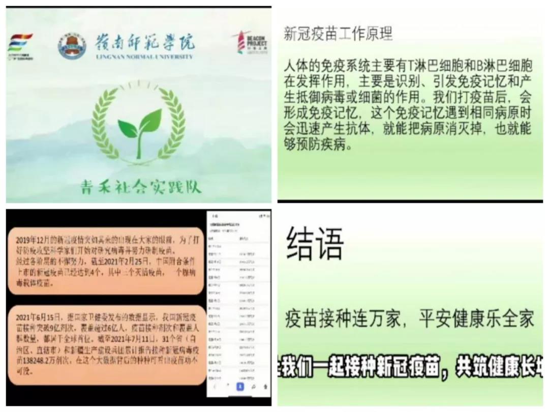 其中,这个视频是组员黄秋月根据组员杨雨鑫、叶丰源同学收集相关的资料,制作出关于疫情和疫苗的PPT,然后她以录屏讲解的方式制作视频。在制作视频的过程中,当黄秋月遇到了视频重点不够突出、时间太长、视频号压缩画质导致画面不清晰等问题时,她坚持努力去寻找解决问题的方法。当面对需要长时间传输视频和导出视频时,黄秋月依旧耐心地等待。经过她坚持不懈的努力,视频最终得到了很好的效果。当记者采访黄秋月在制作视频有什么样感想,她的回答是:“在这过程中,我学会了防控疫情知识、了解新冠疫苗的成分和接种的重要性,疫情虽然到拐点了,但防范意识绝对不能松懈。同时,我也非常感谢队长宁波,她在这期间也给出了很多很好的修改意见,当我修改到很累时她一直陪伴我鼓励我,所以我们这个视频最终才会呈现出来。”