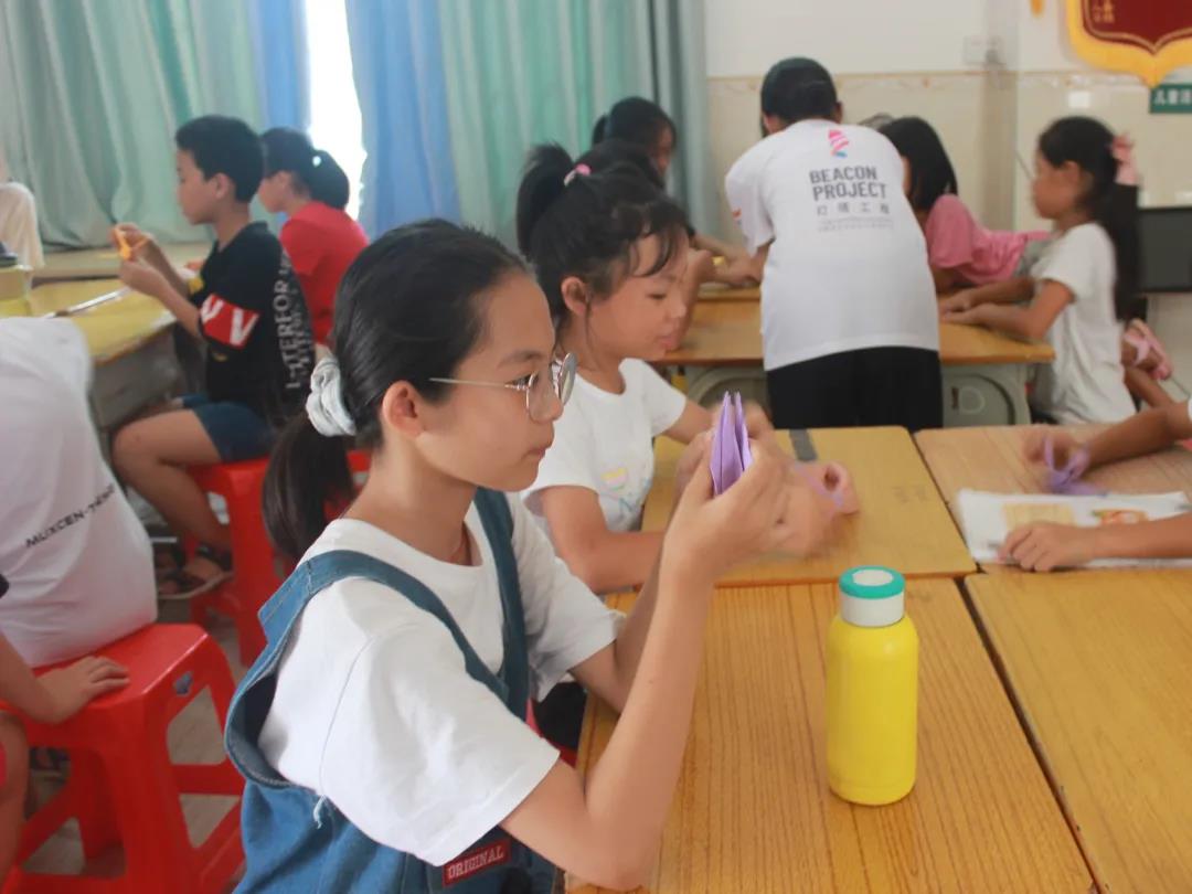 我们还开设了手工课,五颜六色的彩纸,调动了学生们的兴趣。学生们好奇地围观在老师身边,看着普通的一张彩纸变成了飞机、变成了玫瑰、变成了青蛙……学生们也踊跃尝试,把彩纸叠成了一只只象征着希望的千纸鹤。