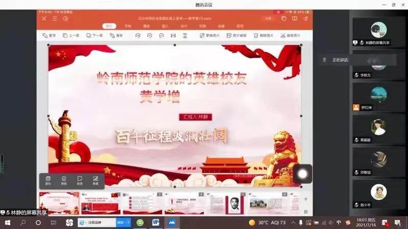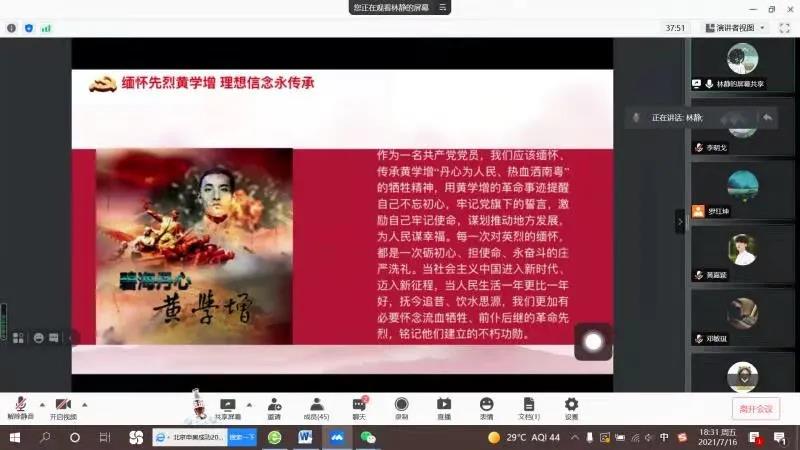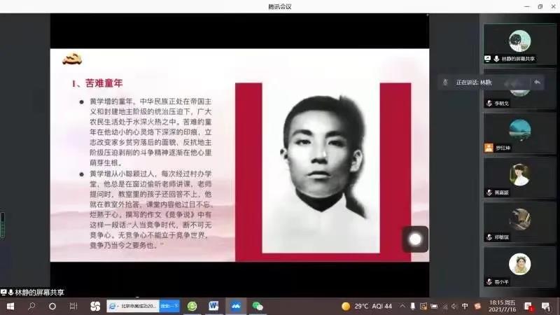 7月16日,“红心向党”社会实践队在腾讯会议中开展了宣讲会,由林静同志进行汇报。本次宣讲会参与人员除本队成员外,还邀请了调研范围内的适龄青年参与。