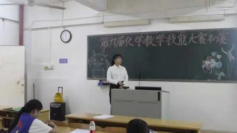 主持人介绍比赛规则后,比赛正式拉开帷幕。初赛阶段以说课为主,选手们说课配合课件和板书进行,主要从教材分析、学情分析、教学目标、教学过程设计,教学重难点和教学设计等方面进行,让评委和其他选手对其所选课题有了一定的了解。其中,选手谢宇豪提前制作的一个实验器材用于二氧化碳的制备让现场观众眼前一亮。